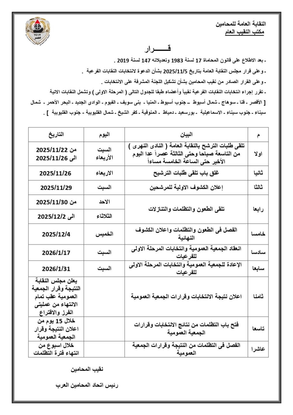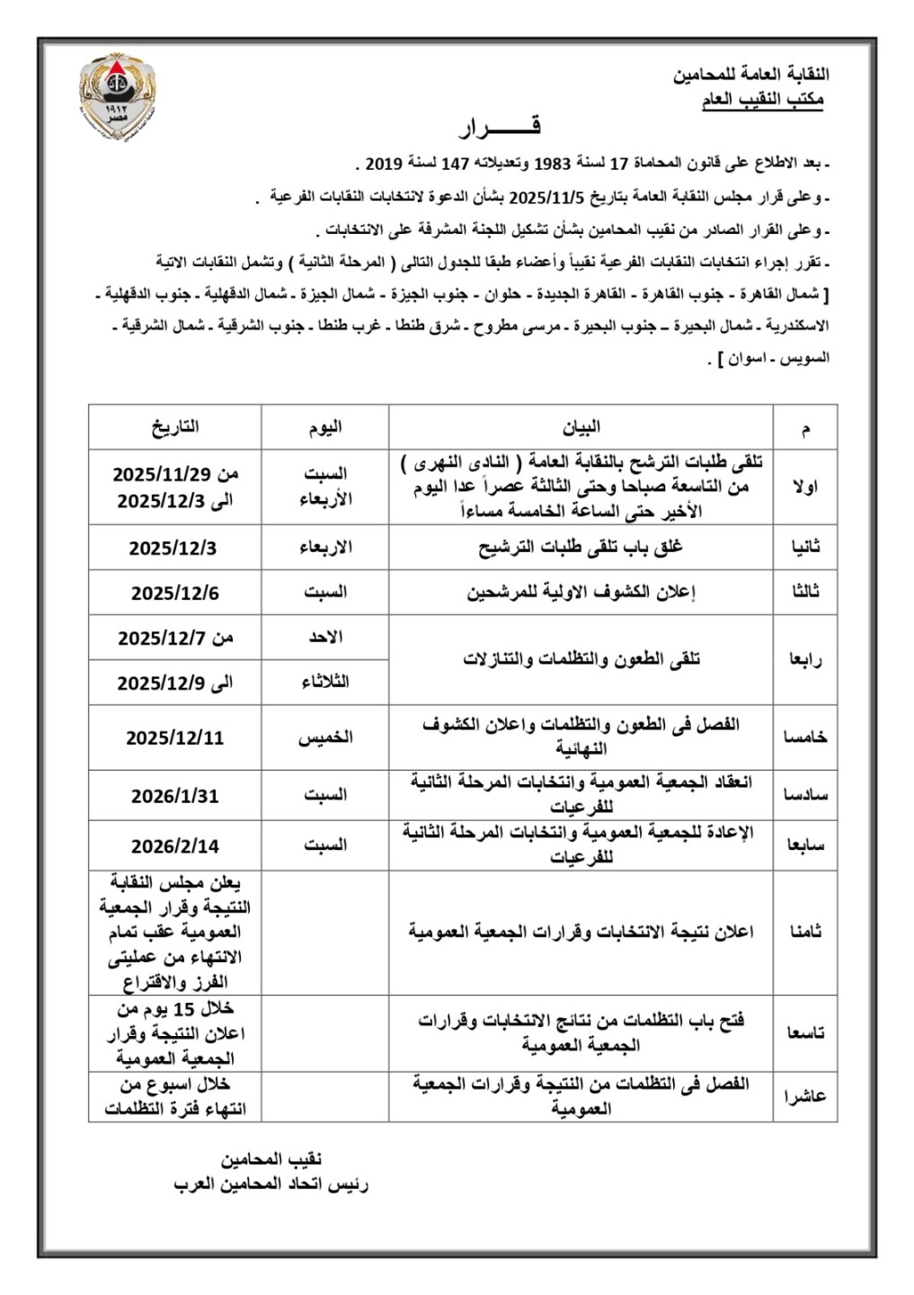 أعلنت النقابة العامة للمحامين، أنه بعد الاطلاع على قانون المحاماة رقم 17 لسنة 1983 وتعديلاته بالقانون رقم 147 لسنة 2019، وعلى قرار مجلس النقابة العامة الصادر في 5 نوفمبر 2025 بشأن الدعوة لانتخابات النقابات الفرعية، وكذلك القرار الصادر من نقيب المحامين بتشكيل اللجنة المشرفة على الانتخابات.