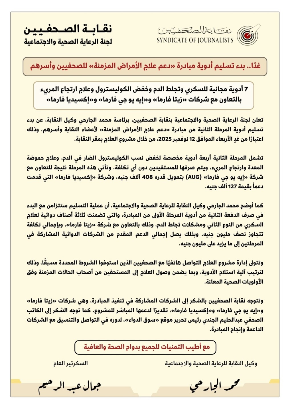 تعلن لجنة الرعاية الصحية والاجتماعية بنقابة الصحفيين، برئاسة محمد الجارحي وكيل النقابة، عن بدء تسليم أدوية المرحلة الثانية من مبادرة «دعم علاج الأمراض المزمنة» لأعضاء النقابة وأسرهم، وذلك اعتبارًا من غدٍ الأربعاء الموافق 12 نوفمبر 2025، من خلال مشروع العلاج بمقر النقابة.