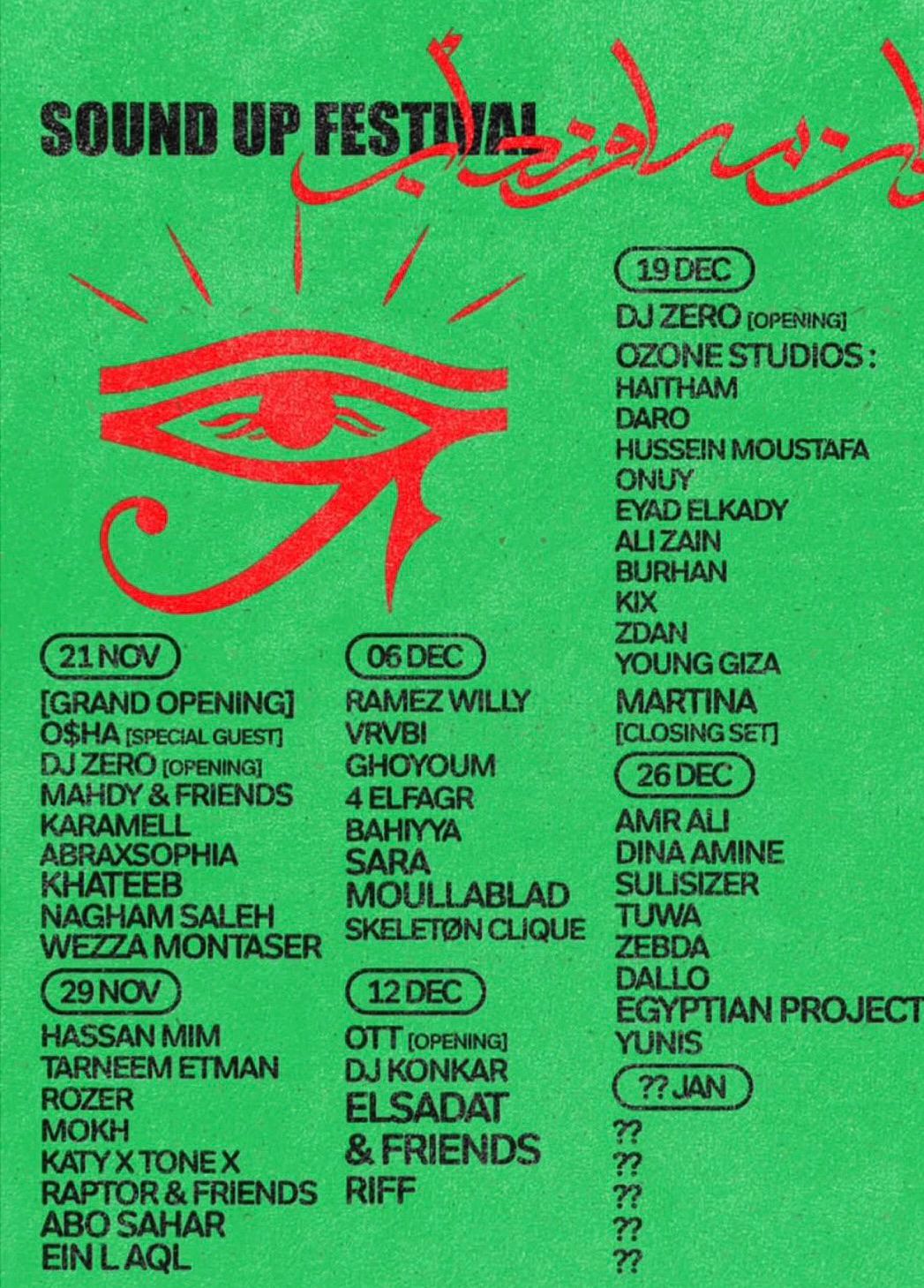 تنطلق في القاهرة فعاليات النسخة الأولى من مهرجان "ساوند أب Sound Up"، الذي يعد أطول مهرجان موسيقي من نوعه في مصر، حيث يمتد لمدة 12 أسبوعًا متواصلة، من 21 نوفمبر وحتى فبراير المقبل، في منطقة عين الحياة بالفسطاط.
