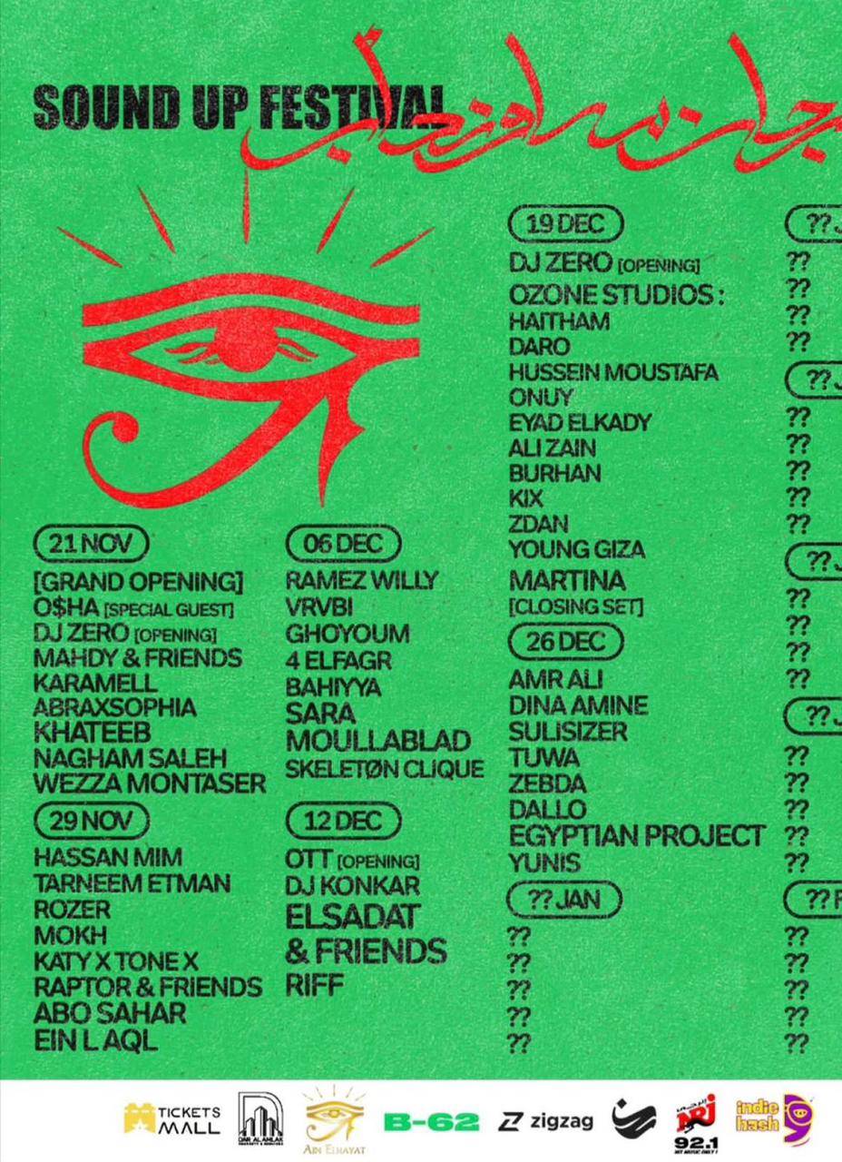 ويستضيف “ساوند أب" خلال ثلاثة أشهر نخبة من نجوم الموسيقى الشباب، من بينهم نجم المهرجانات الشعبية السادات، والمطربة المغربية سارة مول البلاد، وفرقة إيجيبشيان بروجكت، وفرقة بهية، إلى جانب باقة من الباندات والمواهب الصاعدة. ويأتي المهرجان بتنظيم من خالد برجونا B62 وزجزاج، وبرعاية إعلامية لكل من اندهاش indiehash وراديو إنرجي.