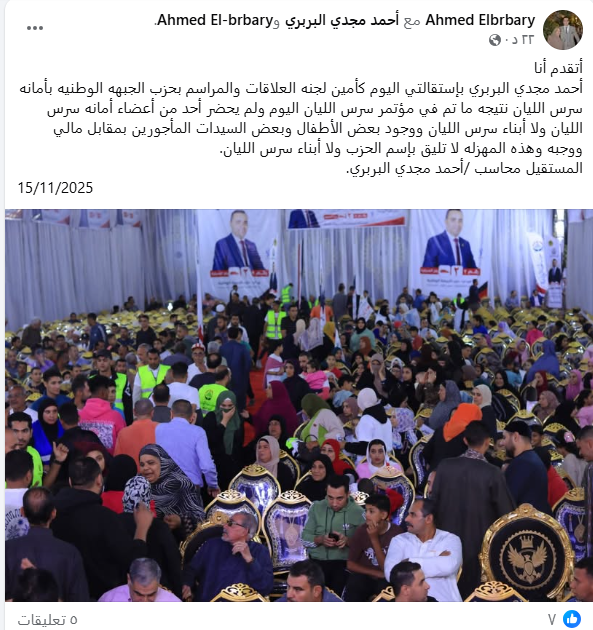 أحمد البربري أمين العلاقات والمراسم بأمانة حزب الجبهة الوطنية بسرس الليان يعلن استقالته بسبب فوضى مؤتمر الحزب