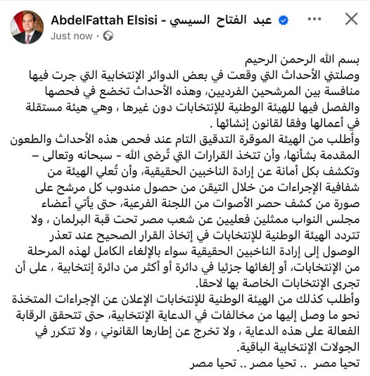 وأعطى هذا البيان رسالة للجميع أن الرئيس يتابع كل صغيرة وكبيرة، وأنه يسمع شكاوى المرشحين والمواطنين، ولن يسمح بتزوير إرادة الشعب، حتى لو وصل الأمر إلى إعادة انتخابات المرحلة الأولى كلها أو في دوائر معينة بها شكاوى فاضحة.