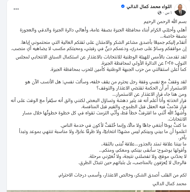 علق النائب والإعلامي أسامة شرشر، رئيس تحرير جريدة النهار، على إعلان اللواء محمد كمال الدالي محافظ الجيزة السابق، انسحابه من جولة الإعادة في انتخابات المرحلة الأولى لمجلس النواب، وإعلانه الاستقالة من منصبه كأمين لحزب الجبهة الوطنية بمحافظة الجيزة، قائلا: الأخ والصديق الغالي اللواء كمال الدالي «احترمت نفسك فاحترمك الناس»