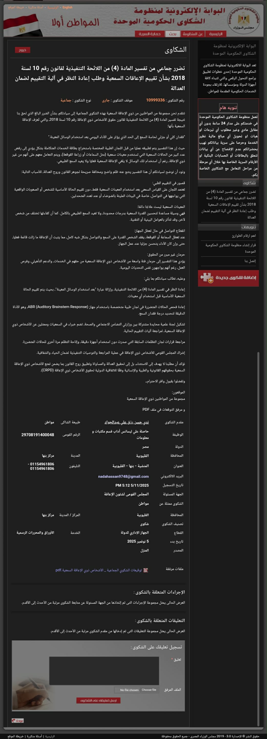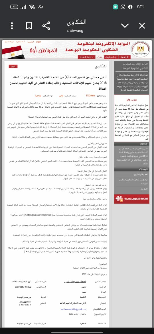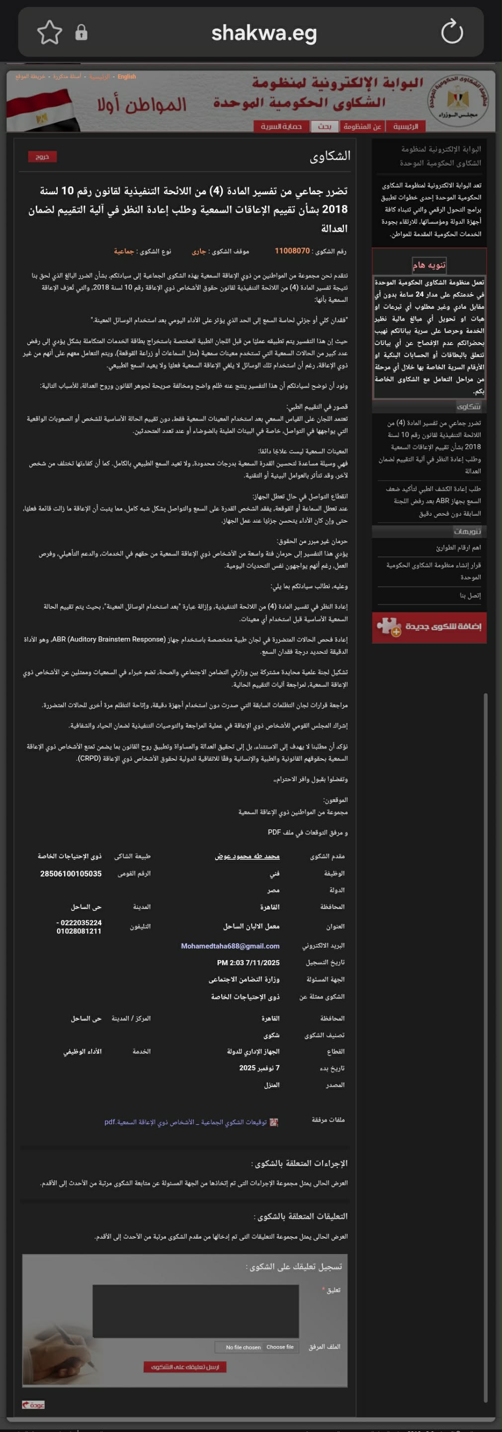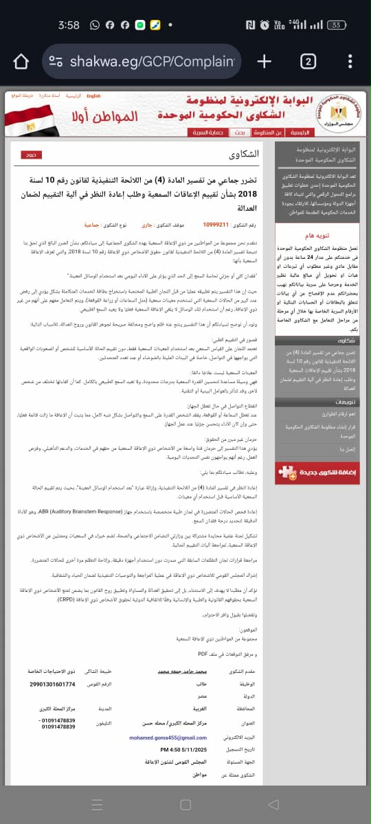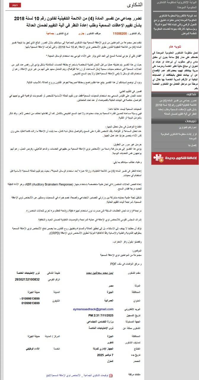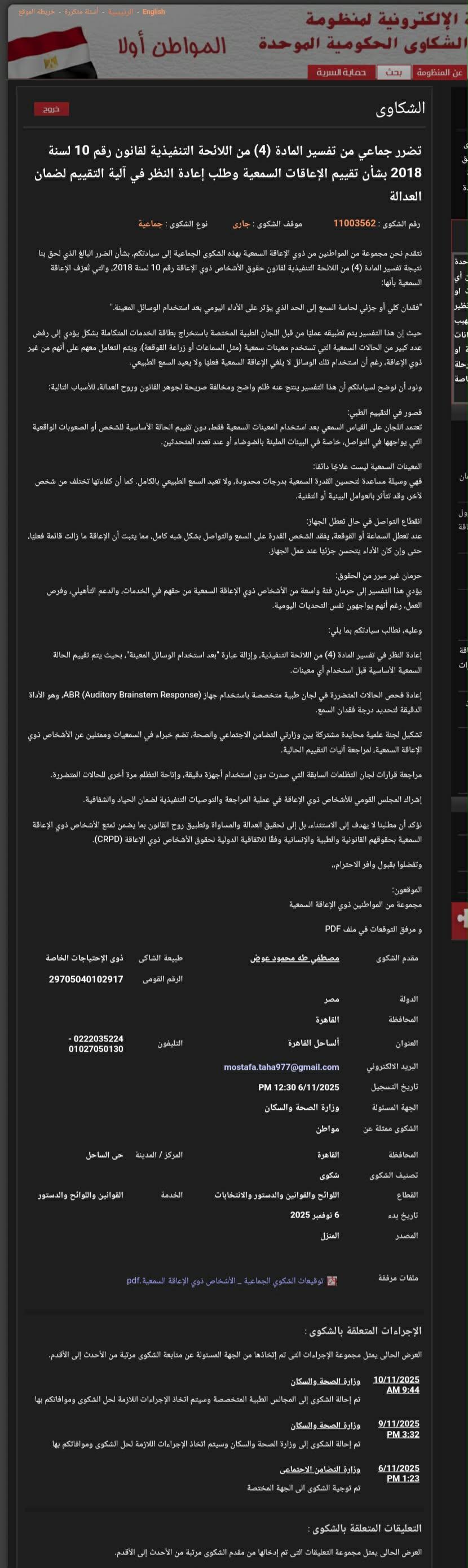 تقدم مجموعة من المواطنين من ذوي الإعاقة السمعية بشكوى جماعية إلى الجهات المختصة ومنظومة الشكاوي برئاسة الوزراء، مؤكدين تعرضهم لضرر بالغ نتيجة تفسير المادة (4) من اللائحة التنفيذية لقانون حقوق الأشخاص ذوي الإعاقة رقم 10 لسنة 2018، والتي تعرف الإعاقة السمعية بأنها: "فقدان كلي أو جزئي لحاسة السمع إلى الحد الذي يؤثر على الأداء اليومي بعد استخدام الوسائل المعينة".