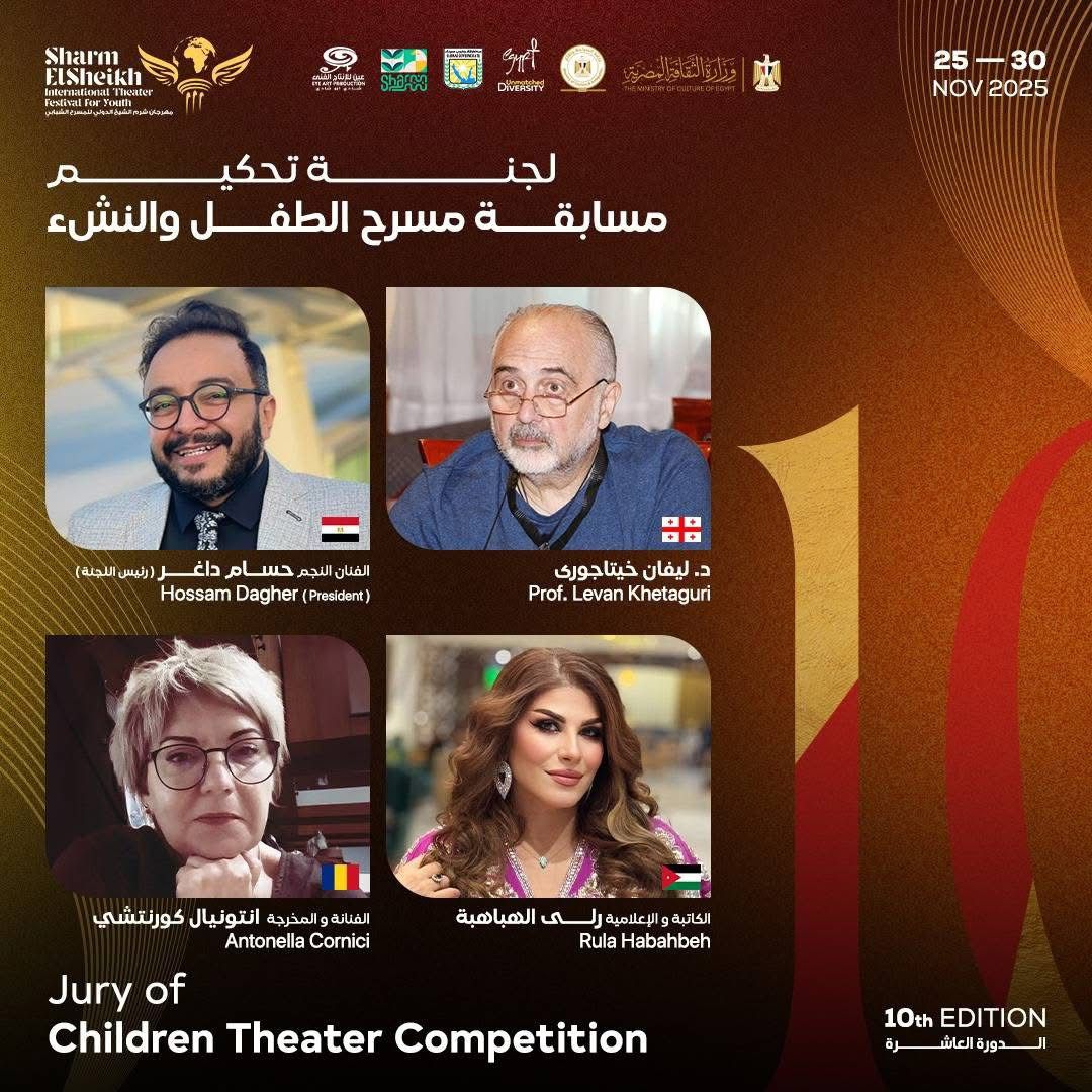 و أعلن الفنان حسام داغر خلال المؤتمر الصحفي الخاص بتفاصيل الدورة العاشرة لمهرجان شرم الشيخ الدولي للمسرح الشبابي، برئاسة الفنان والمخرج مازن الغرباوي، عن أسماء لجنة تحكيم مسابقة مسرح الطفل.