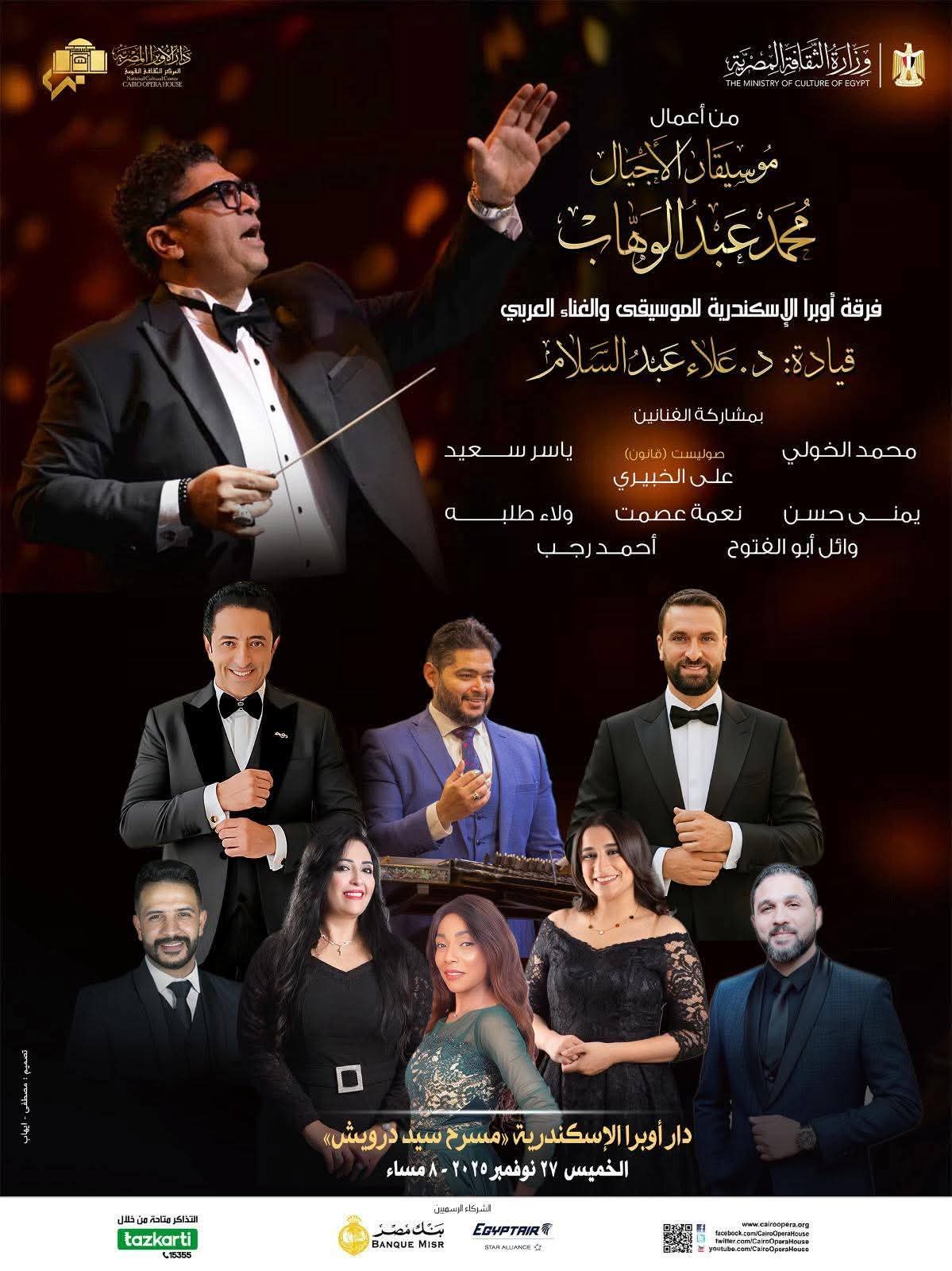 يقود المايسترو الدكتور علاء عبد السلام رئيس دار الأوبرا المصرية حفلاً لفرقة أوبرا الإسكندرية للموسيقى والغناء العربى يقام فى الثامنة مساء الخميس ٢٧ نوفمبر على مسرح سيد درويش " أوبرا الإسكندرية "