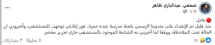 وأضاف: فور إبلاغي توجهت للمستشفى، وأخبروني ان الحالة تحت الملاحظة، ووفقا لما أخبرني به الضابط الموجود بالمستشفى جاري تحرير محضر.