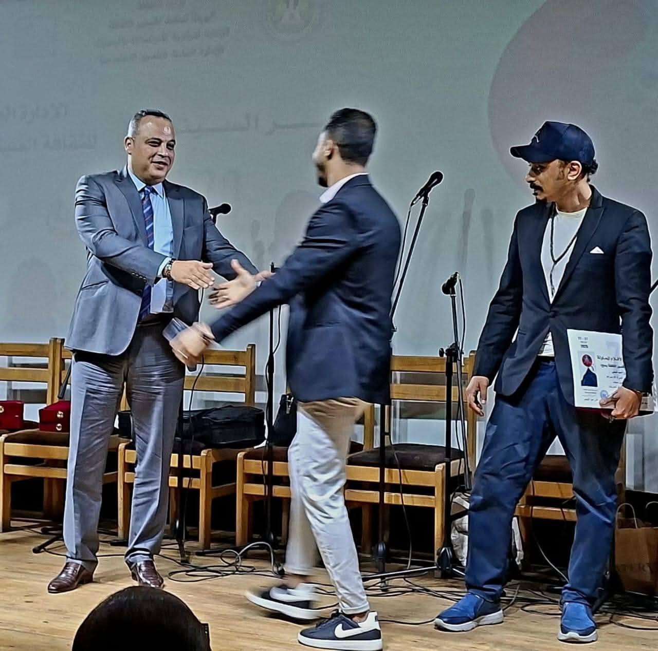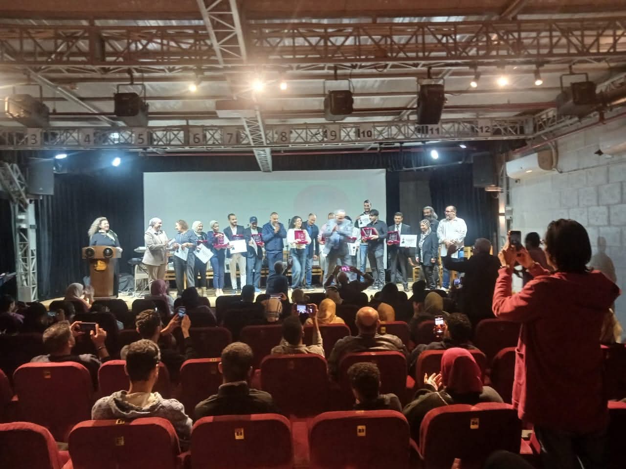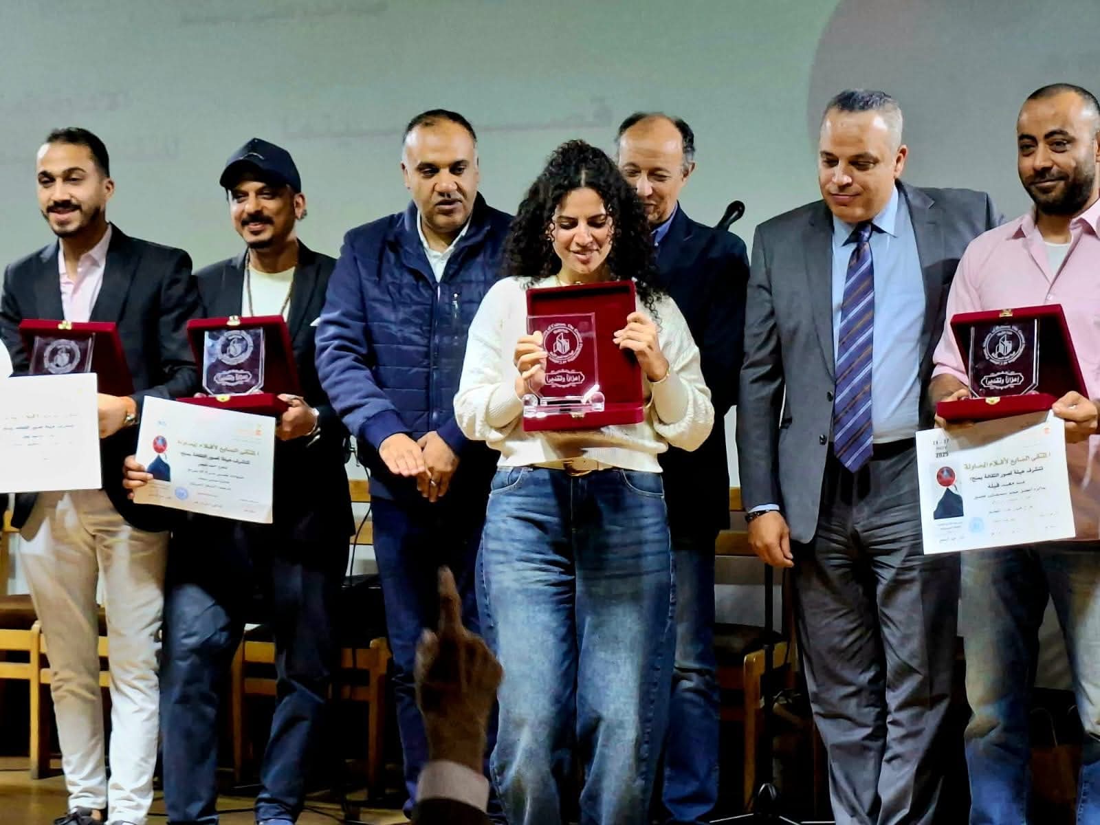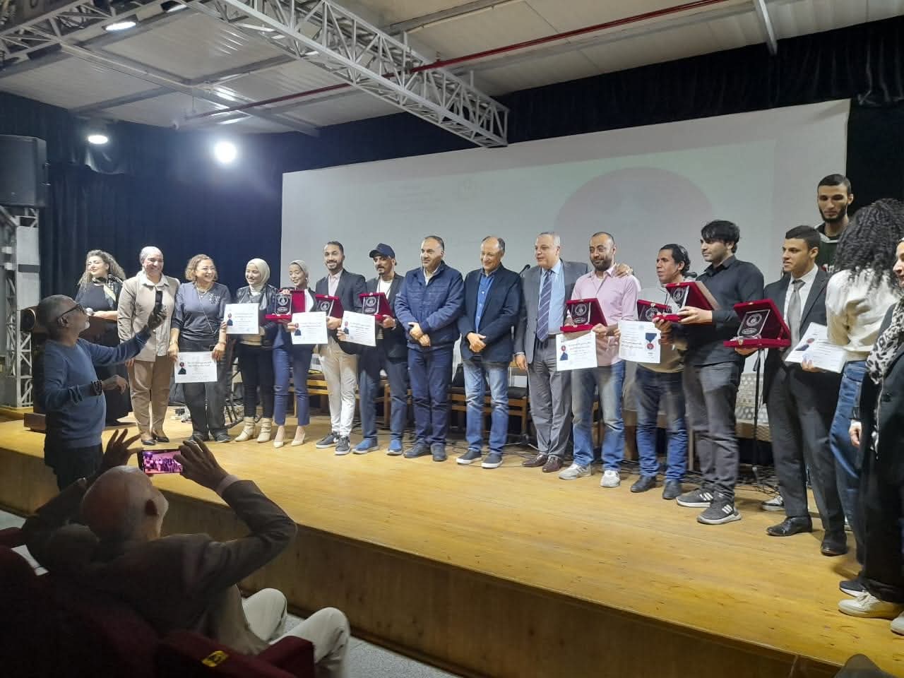 وفي نهاية الحفل صعد الفائزون لإلتقاط الصور التذكارية مع الفنان تامر عبدالمنعم مدير عام الإدارة العامة للثقافة السينمائية والأستاذة سهام بحر مدير قصر السينما.