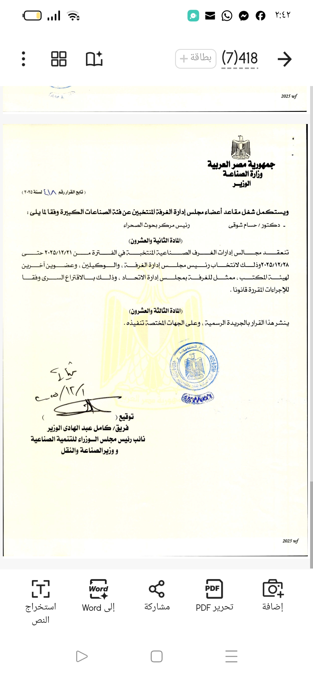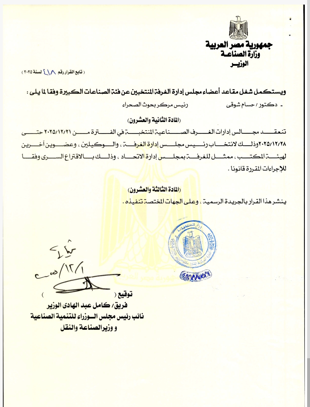 كما نص القرار على أن يستكمل شغل مقاعد أعضاء مجلس إدارة المنتخبين عن فئة الصناعات الكبيرة بتعين الدكتور حسام شوقي رئيس مركز بحوث الصحراء.