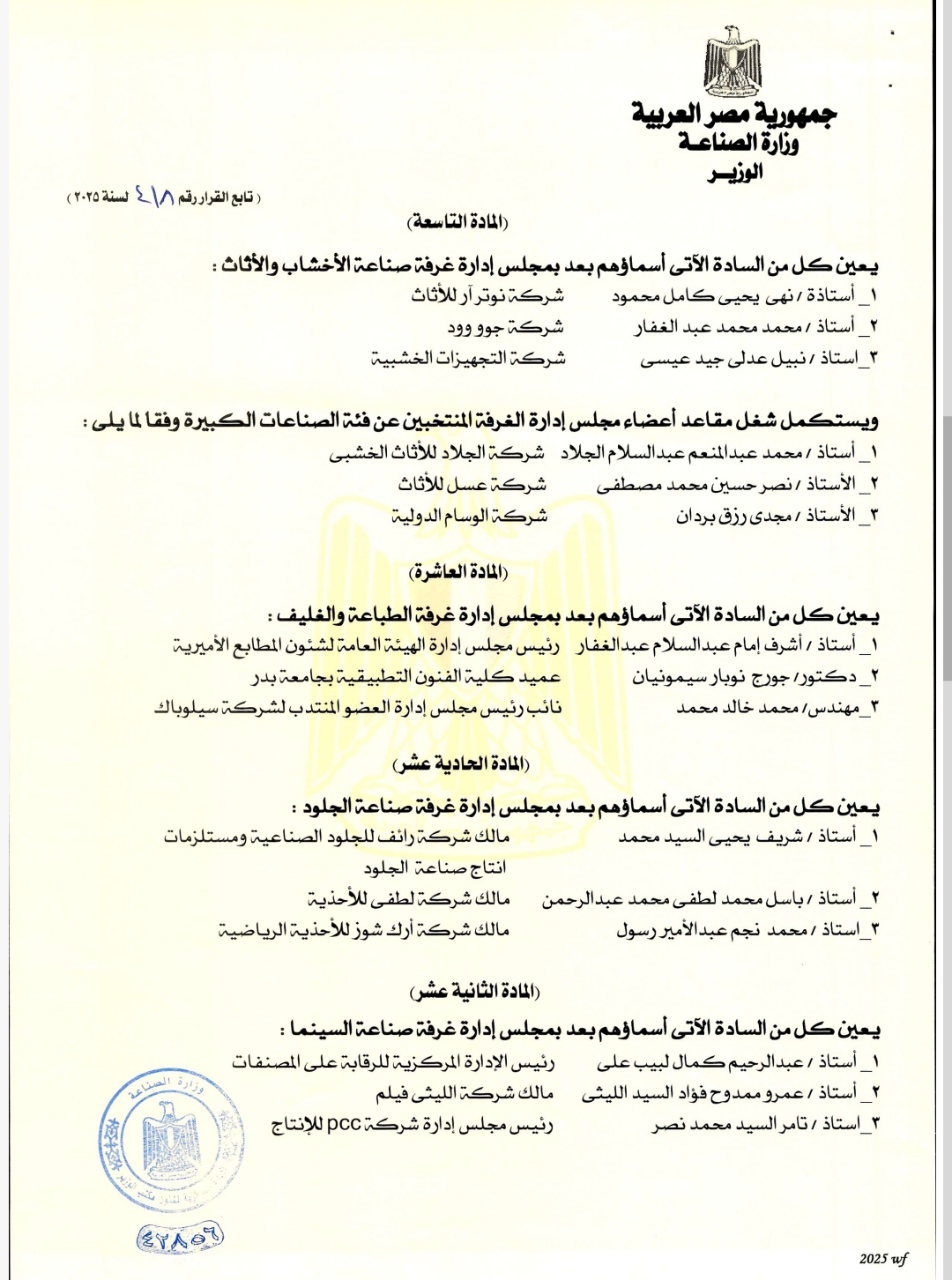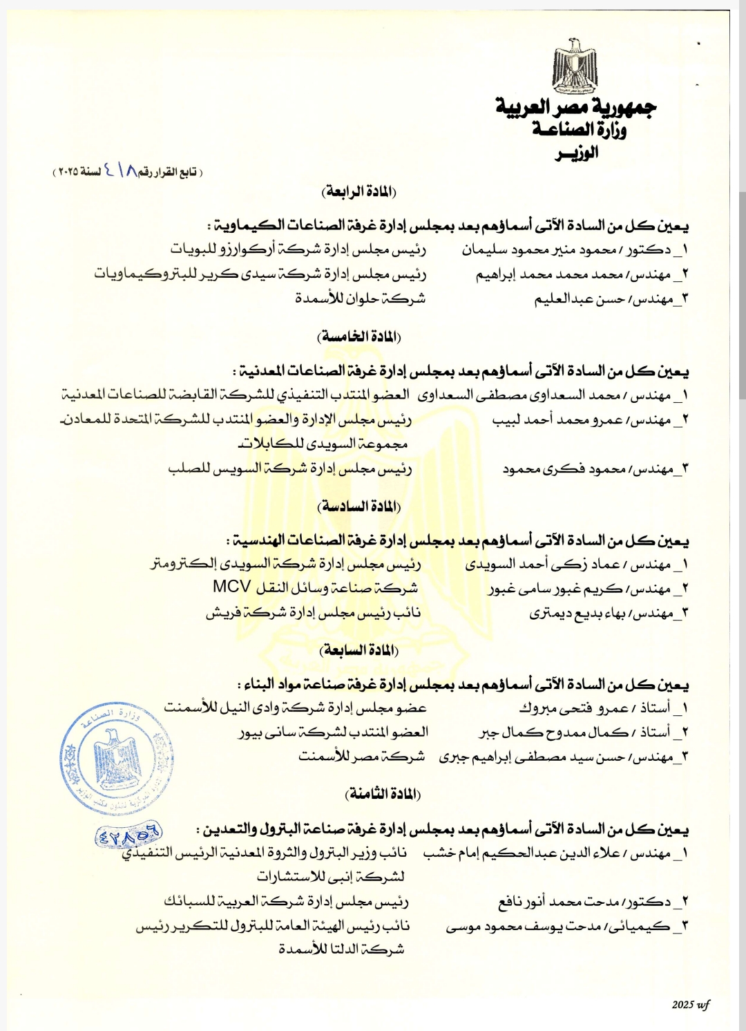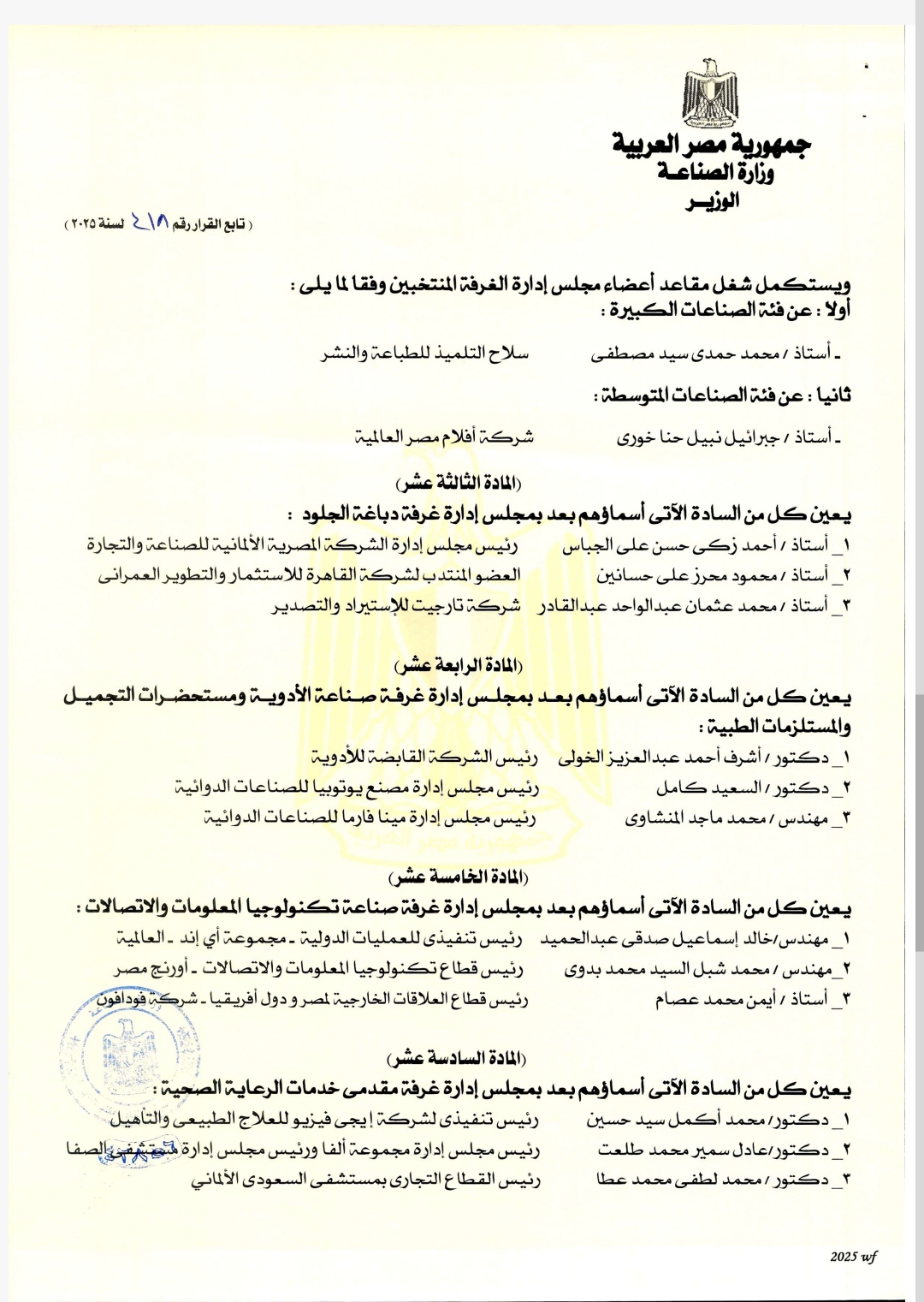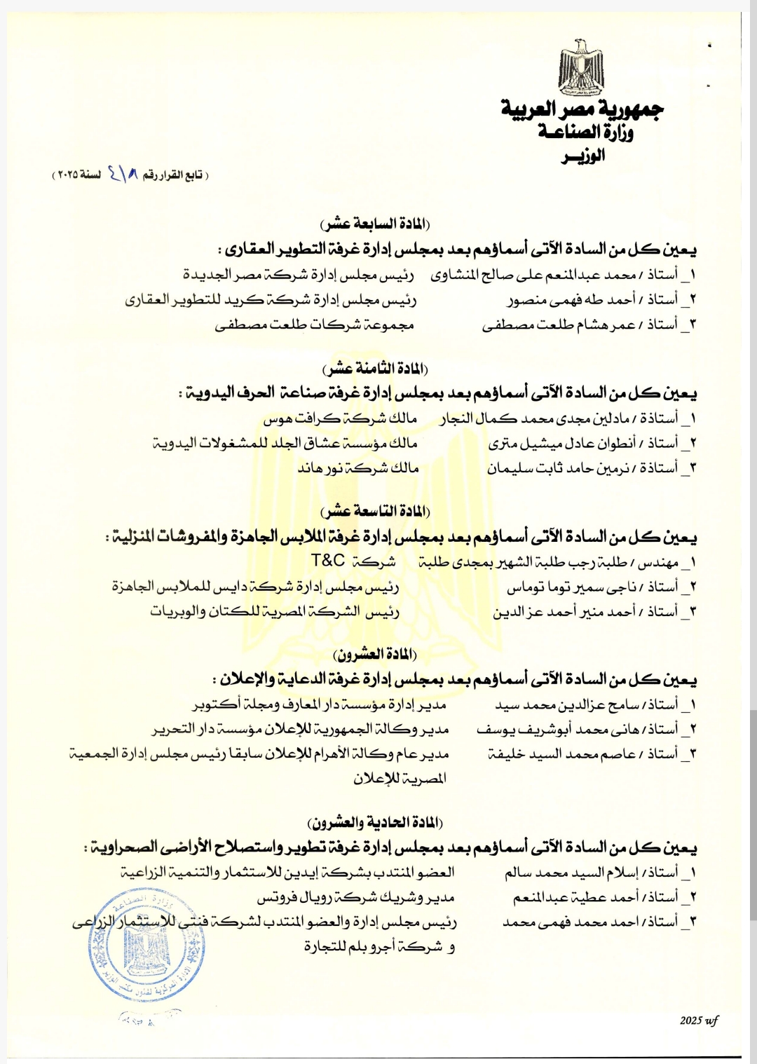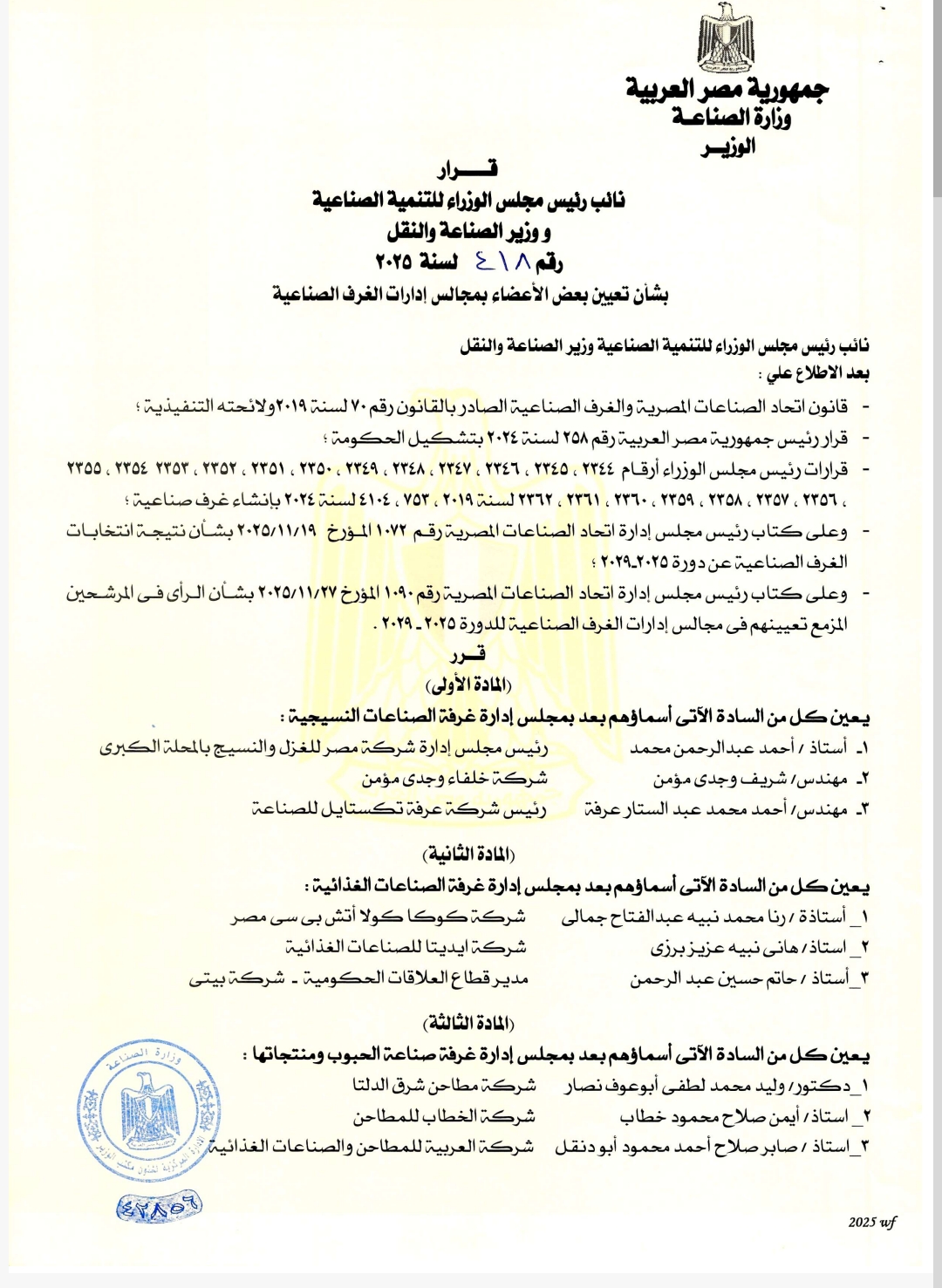 أصدر الفريق كامل الوزير نائب رئيس مجلس الوزراء للتنمية الصناعية ووزير الصناعة والنقل، قرار رقم 418 لسنة 2025، بتعيينات بعض أعضاء مجالس إدارات الغرف الصناعية باتحاد الصناعات المصرية.
