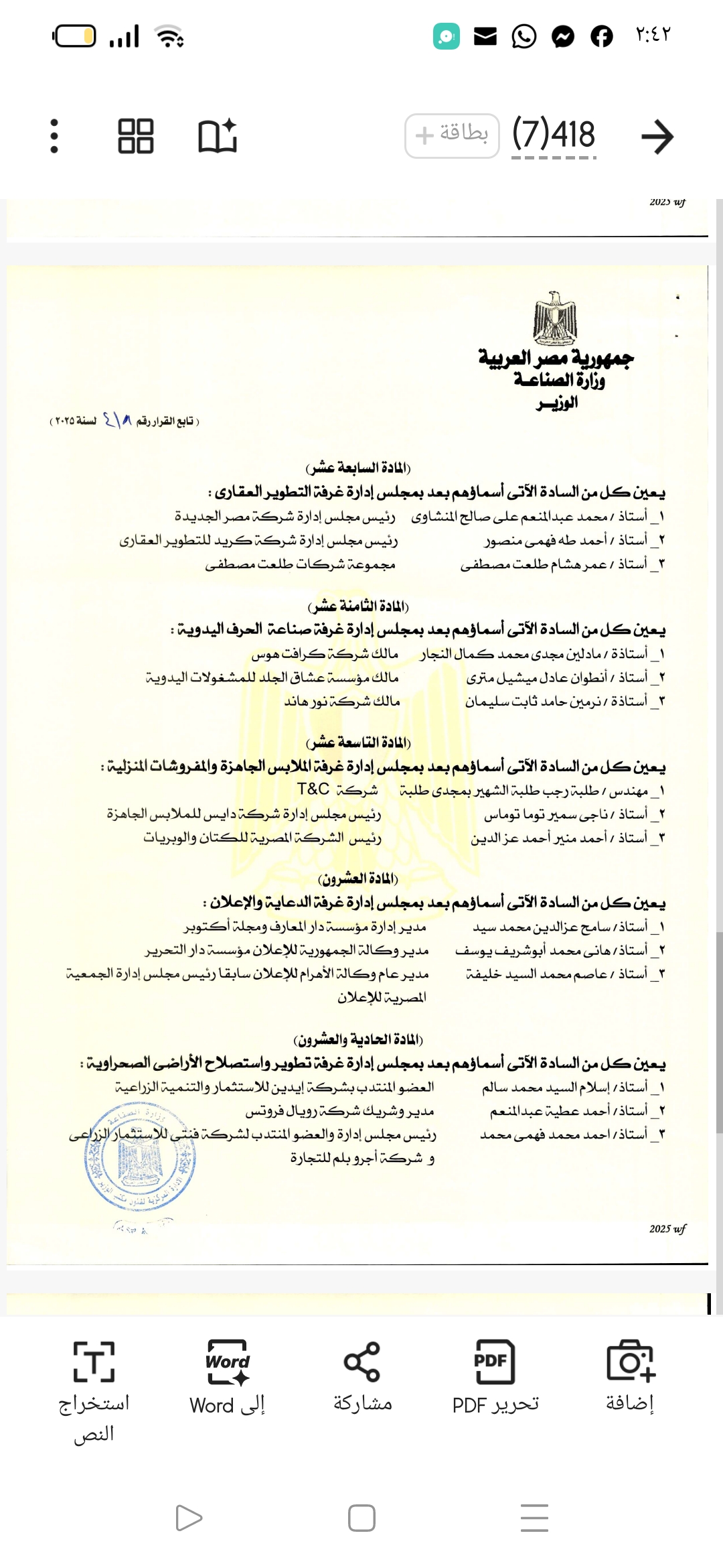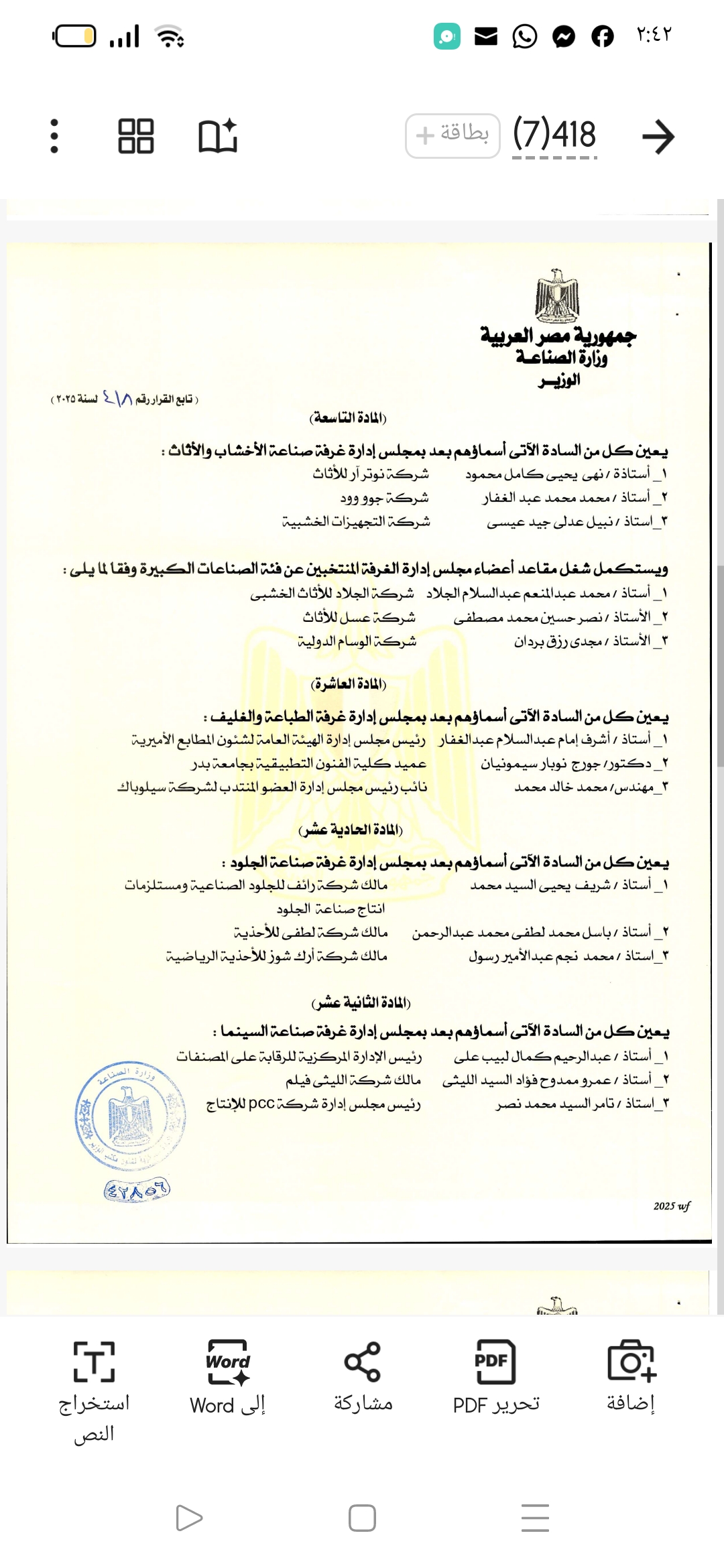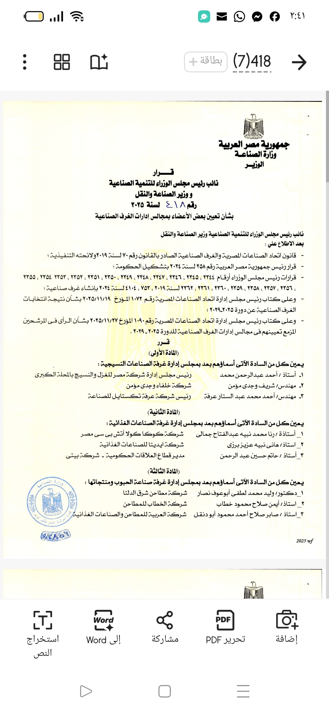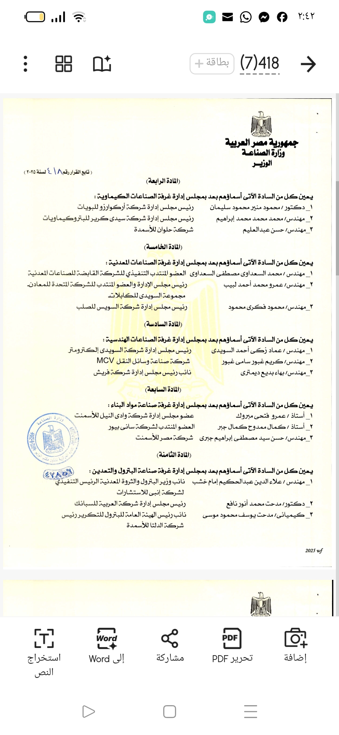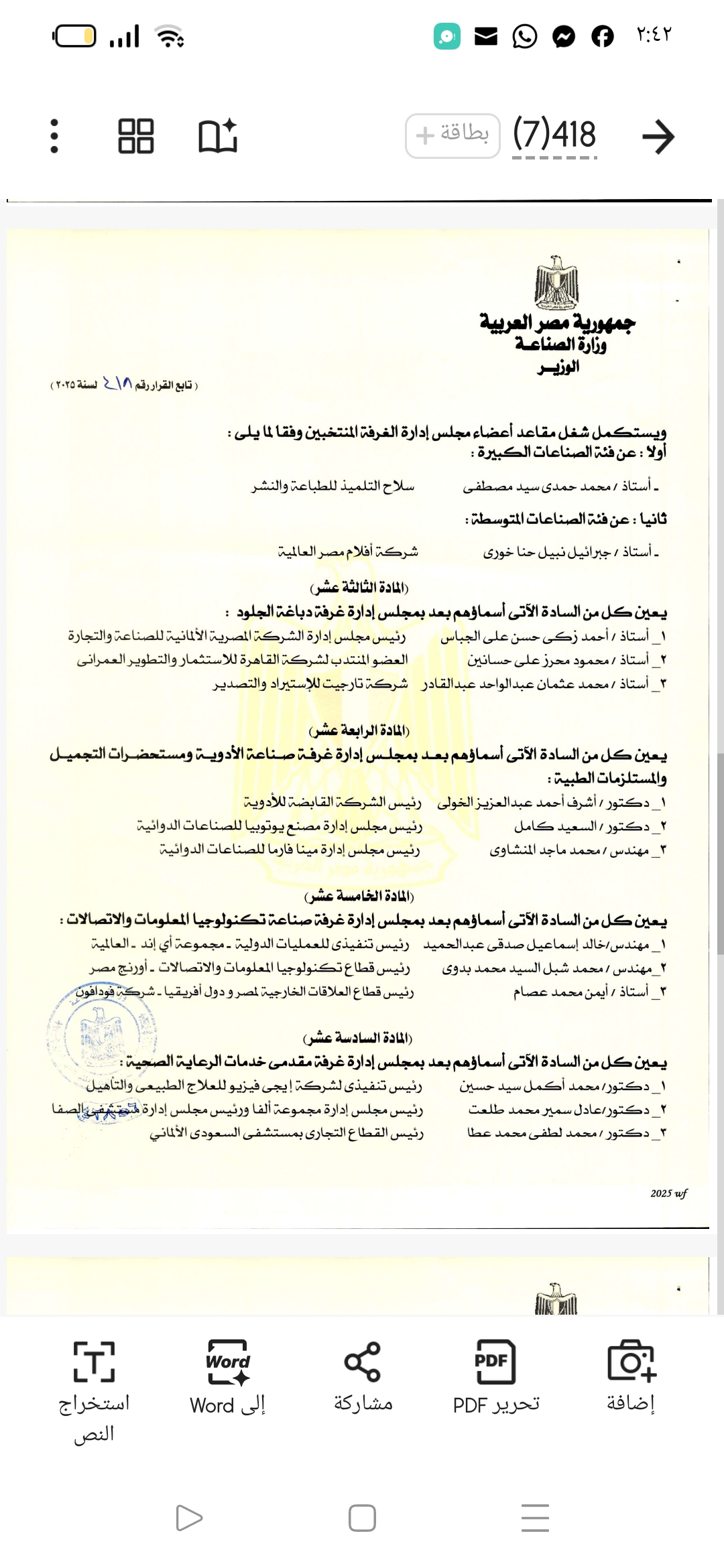 أصدر الفريق كامل الوزير نائب رئيس مجلس الوزراء للتنمية الصناعية ووزير الصناعة والنقل، قرار رقم 418 لسنة 2025، بتعيينات بعض أعضاء مجالس إدارات الغرف الصناعية باتحاد الصناعات المصرية.