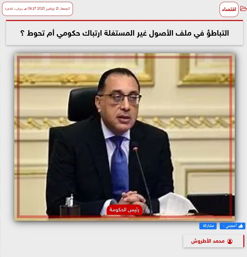كانت جريدة النهار المصرية، نشرت تقريرا في عددها الاربعاء 19 نوفمبر الماضي حول تباطؤ الحكومة في تنفيذ برنامج حصر الأصول غير المستغلة وتخارجها من النشاط الاقتصادي لصالح القطاع الخاص حيث لم تحرز تقدما ملحوظا في هذا الاتجاه لمدة عامل كامل خاصةً مع انتقال الحكومة للعاصمة الإدارية.