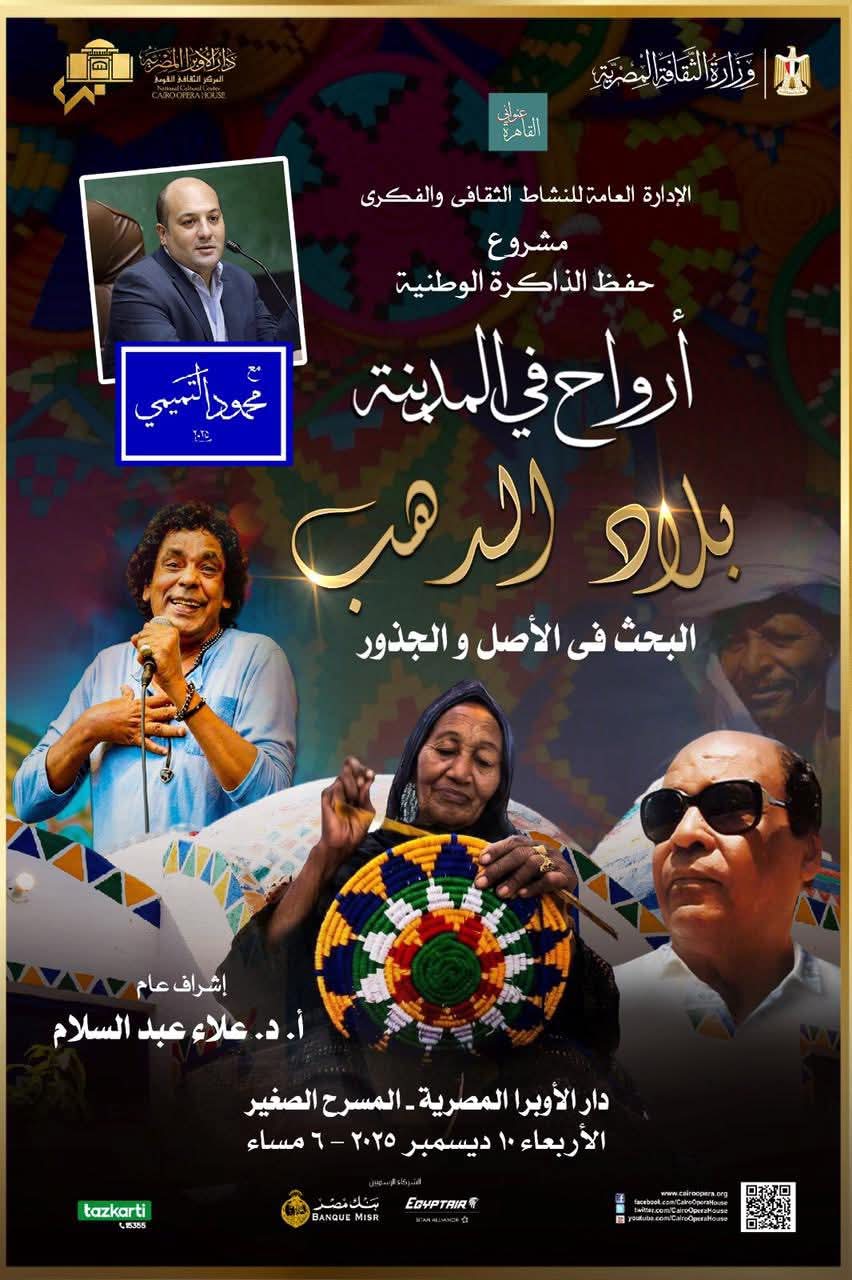 تعقد دار الأوبرا المصرية برئاسة الدكتور علاء عبد السلام ضمن نشاطها الثقافى والفكرى بإشراف رشا الفقى أمسية بعنوان " بلاد الدهب.. البحث فى الأصل والجذور " من سلسلة لقاءات أرواح فى المدينة إعداد وتقديم الكاتب الصحفى محمود التميمى والتى يضمها مشروعه الثقافى القاهرة عنوانى وذلك فى السادسة مساء الأربعاء 10 ديسمبر علي المسرح الصغير .