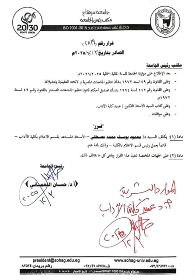 أصدر الأستاذ الدكتور حسان النعماني، رئيس جامعة سوهاج، قرارًا بتكليف الدكتور محمود يوسف السماسيري، الأستاذ المساعد بقسم الإعلام بكلية الآداب، قائمًا بأعمال رئيس قسم الإعلام، وذلك لمدة عام، بناءً على الخطاب المقدم من الأستاذ الدكتور محمد توفيق، عميد كلية الآداب .