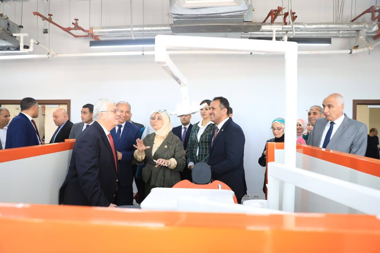 هذا، وقد تفقد الوزير عددًا من المنشآت الأكاديمية والبحثية المتخصصة بعدد من مباني الجامعة حيث اطّلع سيادته على المرحلة الأولى من الوحدات التدريبية بكلية طب الأسنان والتي تضم 3 عيادات تعليمية بسعة إجمالية تبلغ (66) وحدة أسنان، إلى جانب جهاز أشعة بانوراما، بما يوفّر بيئة تدريب إكلينيكي متقدمة تحاكي الواقع المهني بدقة عالية.