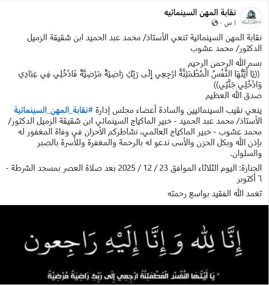 وجاء البيان على النحو التالي: ينعي نقيب السينمائيين والسادة أعضاء مجلس إدارة نقابة المهن السينمائية الأستاذ/ محمد عبد الحميد - خبير الماكياج السينمائي ابن شقيقة الزميل الدكتور/ محمد عشوب - خبير الماكياج العالمي، نشاطركم الأحزان في وفاة المغفور له بإذن الله وبكل الحزن والأسى ندعو له بالرحمة والمغفرة وللأسرة بالصبر والسلوان، الجنازة: اليوم الثلاثاء الموافق 23 / 12 / 2025 بعد صلاة العصر بمسجد الشرطة - ٦ أكتوبر، تغمد الله الفقيد بواسع رحمته.