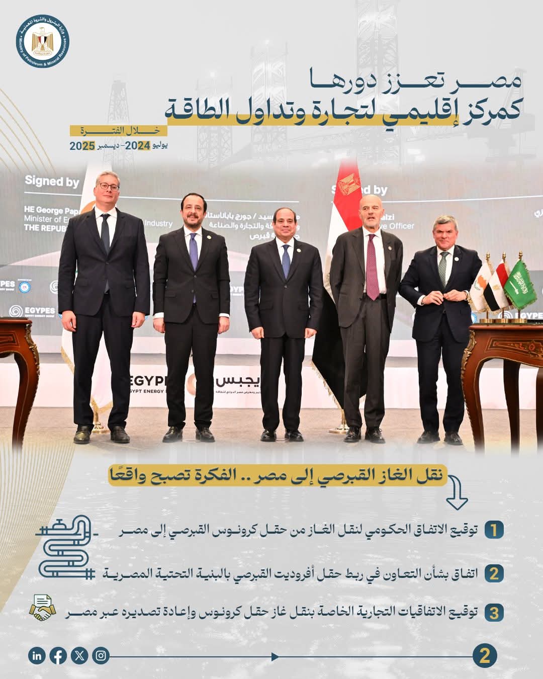وفي إطار تعزيز مكانتها كمركز إقليمي لتداول وتجارة الطاقة وتعظيم الاستفادة من البنية التحتية القوية في قطاع الغاز والموقع الجغرافي كبوابة لأوروبا ، نجحت مصر في تحويل فكرة نقل الغاز القبرصي إلى واقع ملموس، حيث تم توقيع الاتفاق الحكومي لنقل الغاز من حقل "كرونوس" القبرصي إلى مصر في فبراير 2025 في افتتاح مؤتمر ايجبس بحضور فخامة الرئيس عبدالفتاح السيسى وفخامة رئيس قبرص نيكوس كريستودوليدس بما يعكس عمق التعاون بين البلدين في مجال الطاقة.