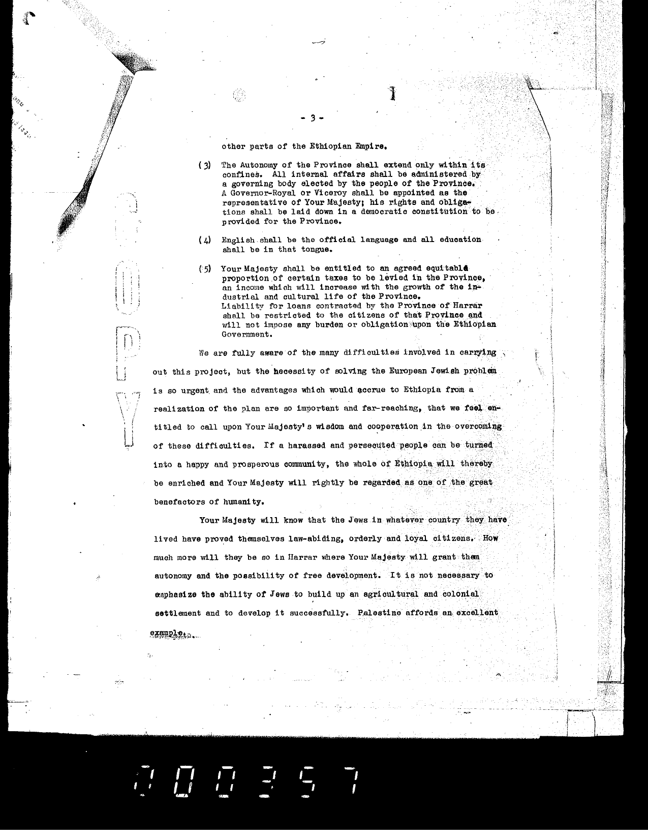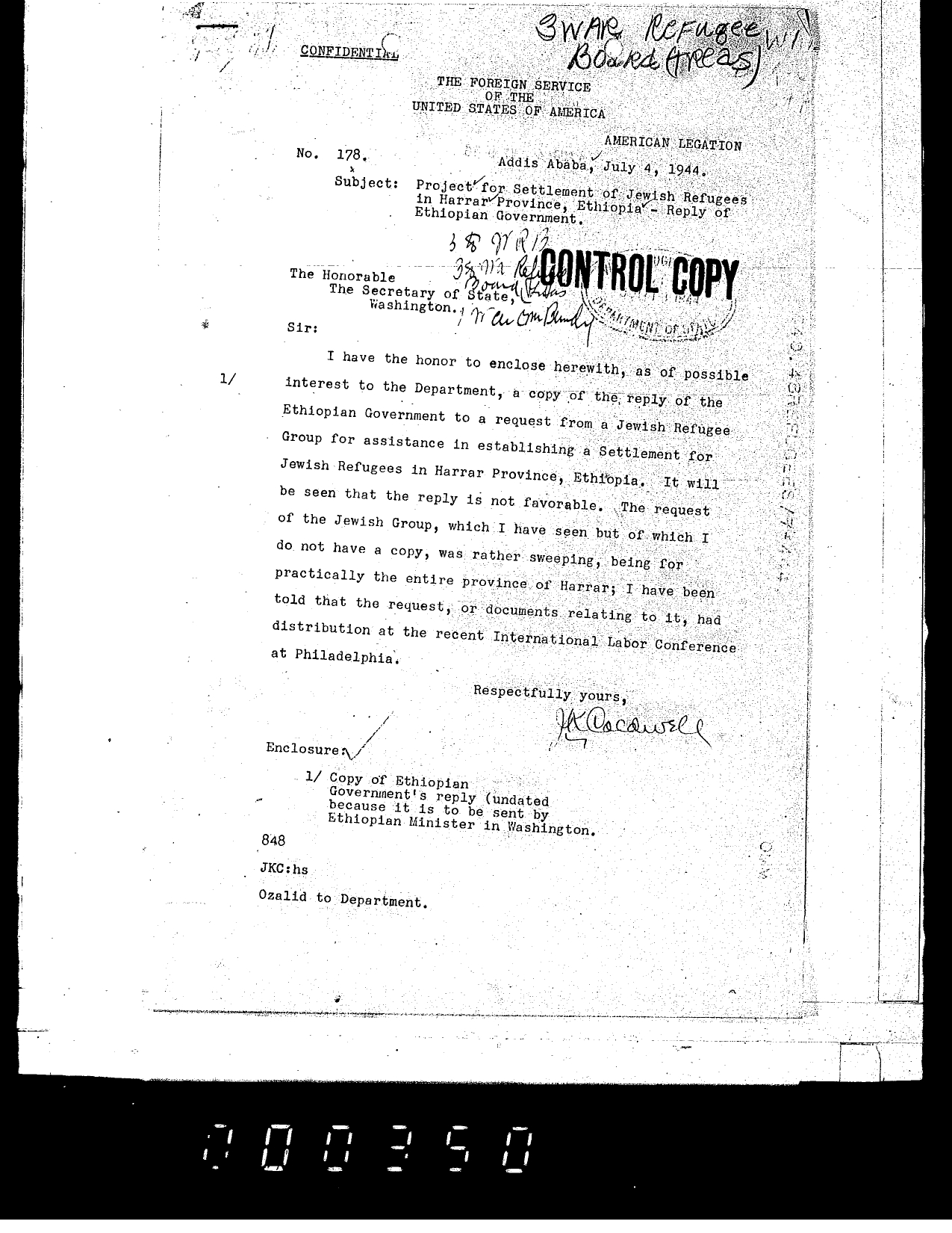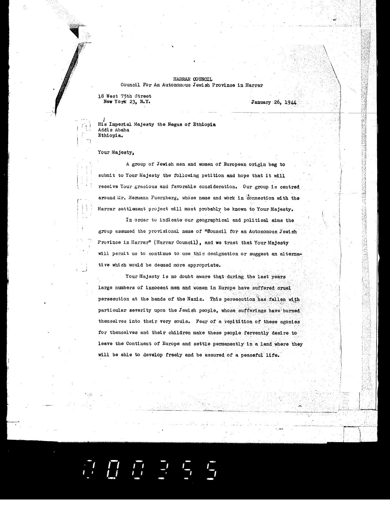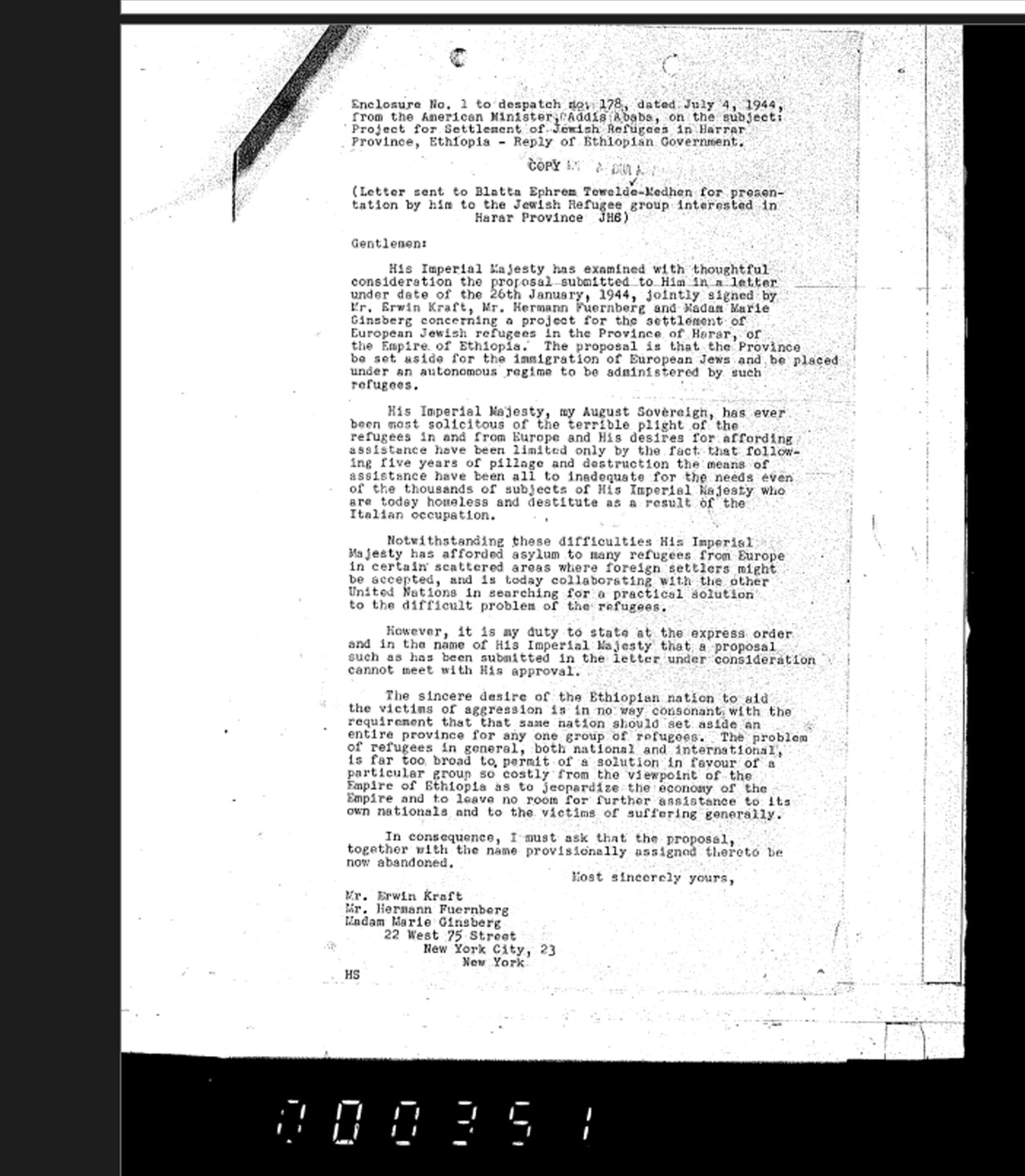 وتتضمن الوثائق مراسلات رسمية تعود إلى يوليو 1944، تشير إلى مشروع لتوطين اللاجئين اليهود في ولاية هرر، وردّ الحكومة الإثيوبية عليه. ويظهر من هذه المراسلات أن الطلب المقدم كان واسع النطاق، إذ شمل فعليًا كامل الولاية، وهو ما قوبل برفض صريح من الجانب الإثيوبي.