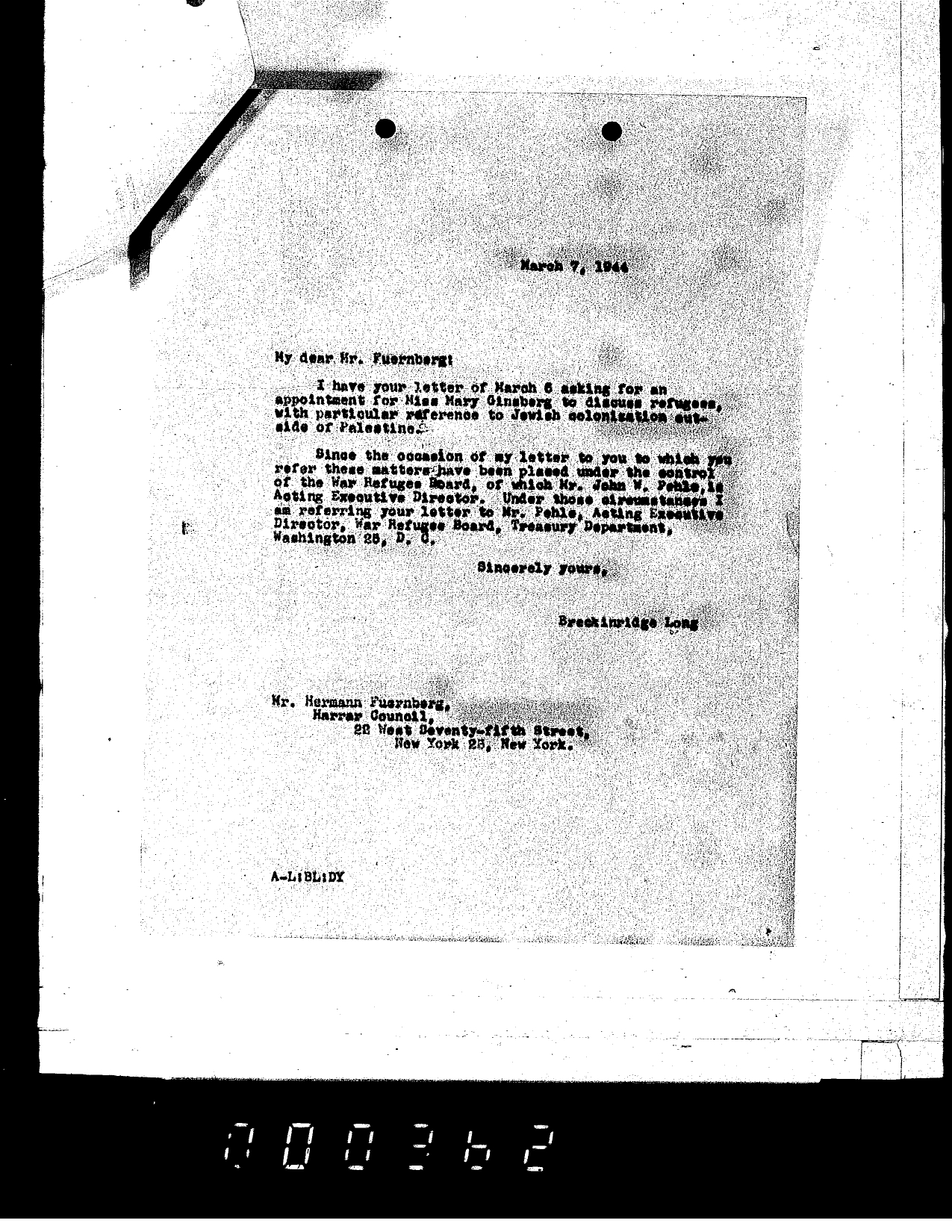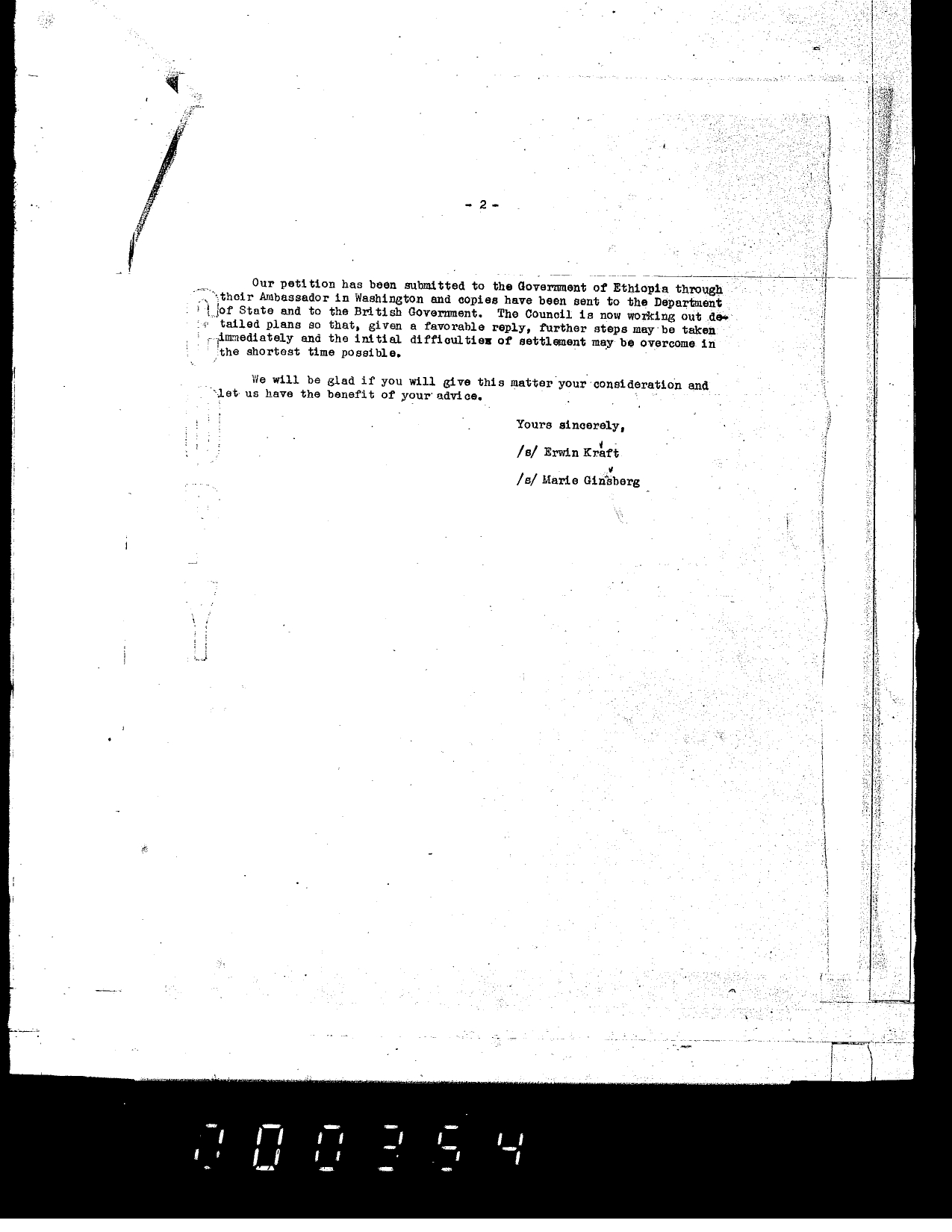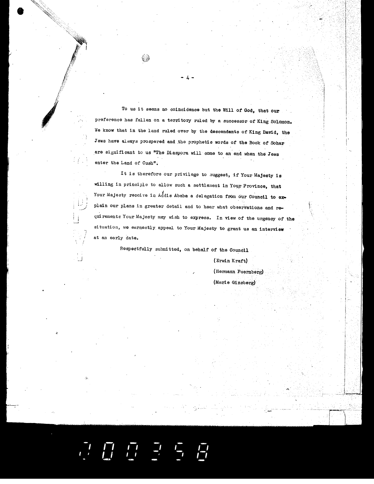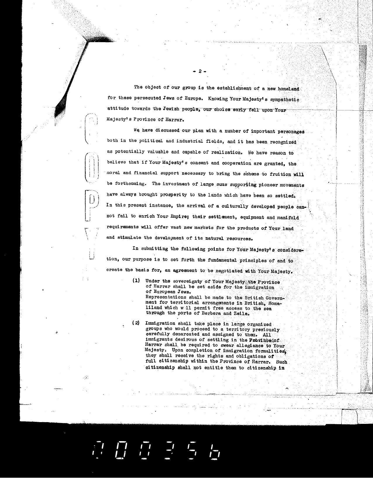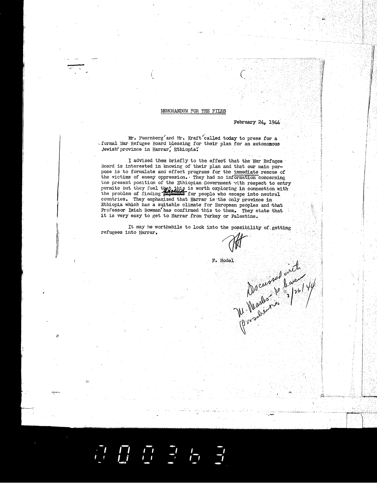 وتتضمن الوثائق مراسلات رسمية تعود إلى يوليو 1944، تشير إلى مشروع لتوطين اللاجئين اليهود في ولاية هرر، وردّ الحكومة الإثيوبية عليه. ويظهر من هذه المراسلات أن الطلب المقدم كان واسع النطاق، إذ شمل فعليًا كامل الولاية، وهو ما قوبل برفض صريح من الجانب الإثيوبي.