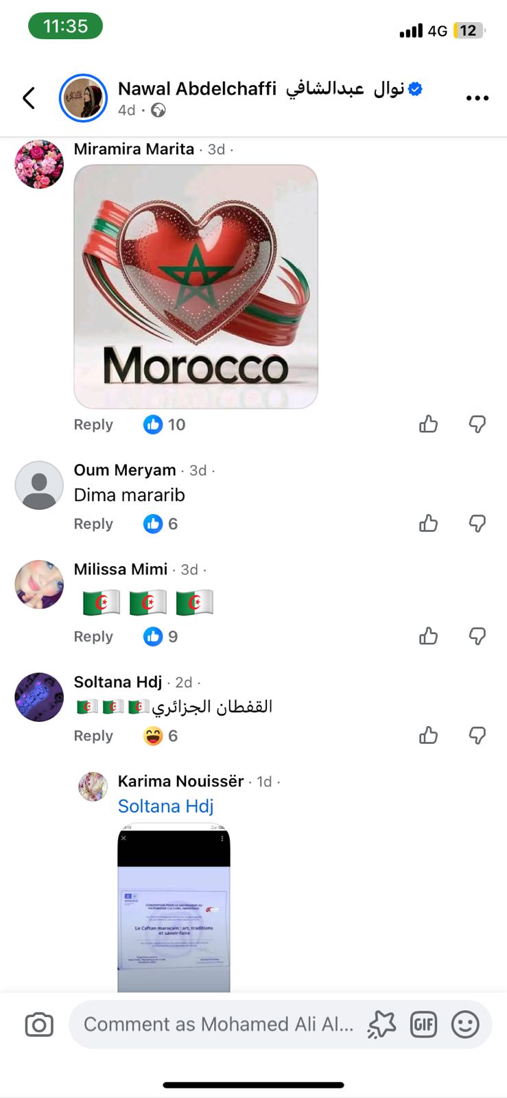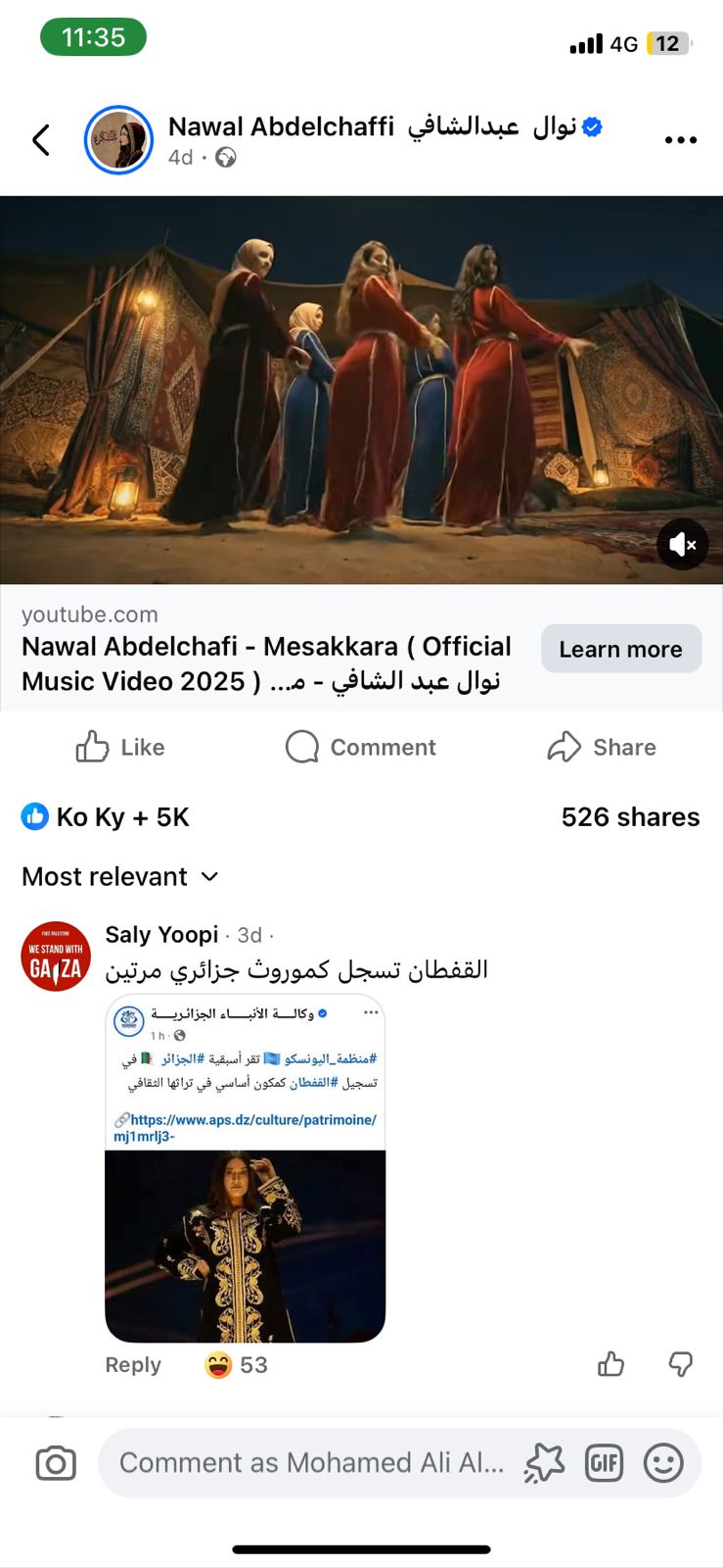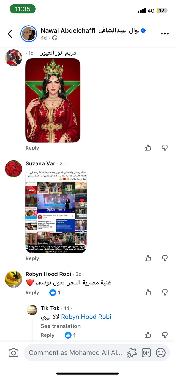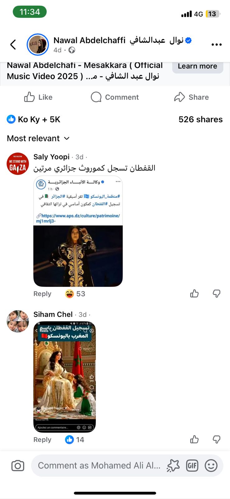 وفي خطوة متميزة، ظهرت نوال عبد الشافي مرتدية القفطان المغربي، مما لفت الأنظار وجعلها حديث متابعيها على وسائل التواصل الاجتماعي، التصميم الفاخر الذي اختارته كان متناسقًا مع أجواء الأغنية، مما أضاف بُعدًا جديدًا للأداء الفني للمطربة، حيث جمع بين الأصالة والأناقة، بينما استمرت الإطلالة المبهرة لنوال في جذب الانتباه والتفاعل من جمهورها، وأثيرت نوال الجدل بالأغنية على أحقية القفطان مغربي أم جزائري، حيث نالت تعليقات كثيرة على السوشيال ميديا ومنصات التواصل الاجتماعى على تلك الموضوع .