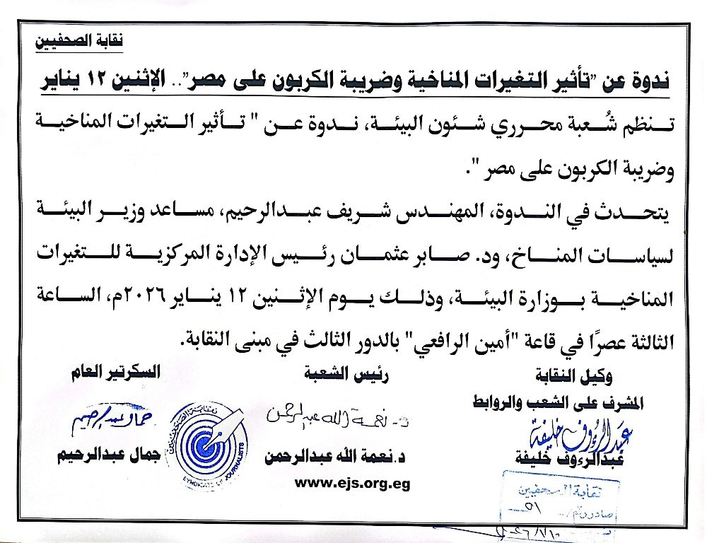 يتحدث في الندوة، المهندس شريف عبدالرحيم، مساعد وزير البيئة لسياسات المناخ، ود. صابر عثمان رئيس الإدارة المركزية للتغيرات المناخية بوزارة البيئة، وذلك يوم الإثنين 12 يناير 2026م، الساعة الثالثة عصرًا في قاعة "أمين الرافعي" بالدور الثالث في مبنى النقابة.