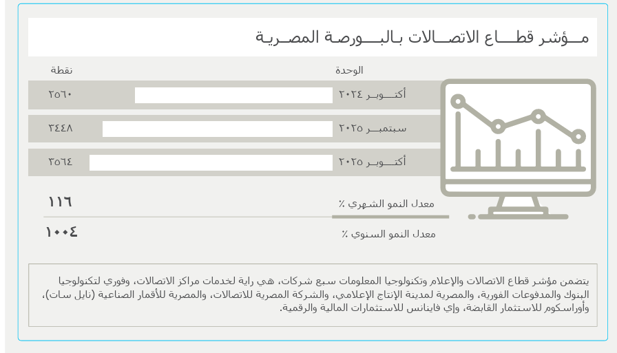 كشفت بيانات وزارة الاتصالات عن ارتفاع مؤشر قطاع الاتصالات بالبورصة المصرية لنحو 3564 نقطة خلال شهر اكتوبر من عام 2025 مقارنة بنحو2560 نقطة خلال شهر أكتوبر 2024. في حين سجل المؤشر في سبتمبر 2025 نحو 3448 نقطة.