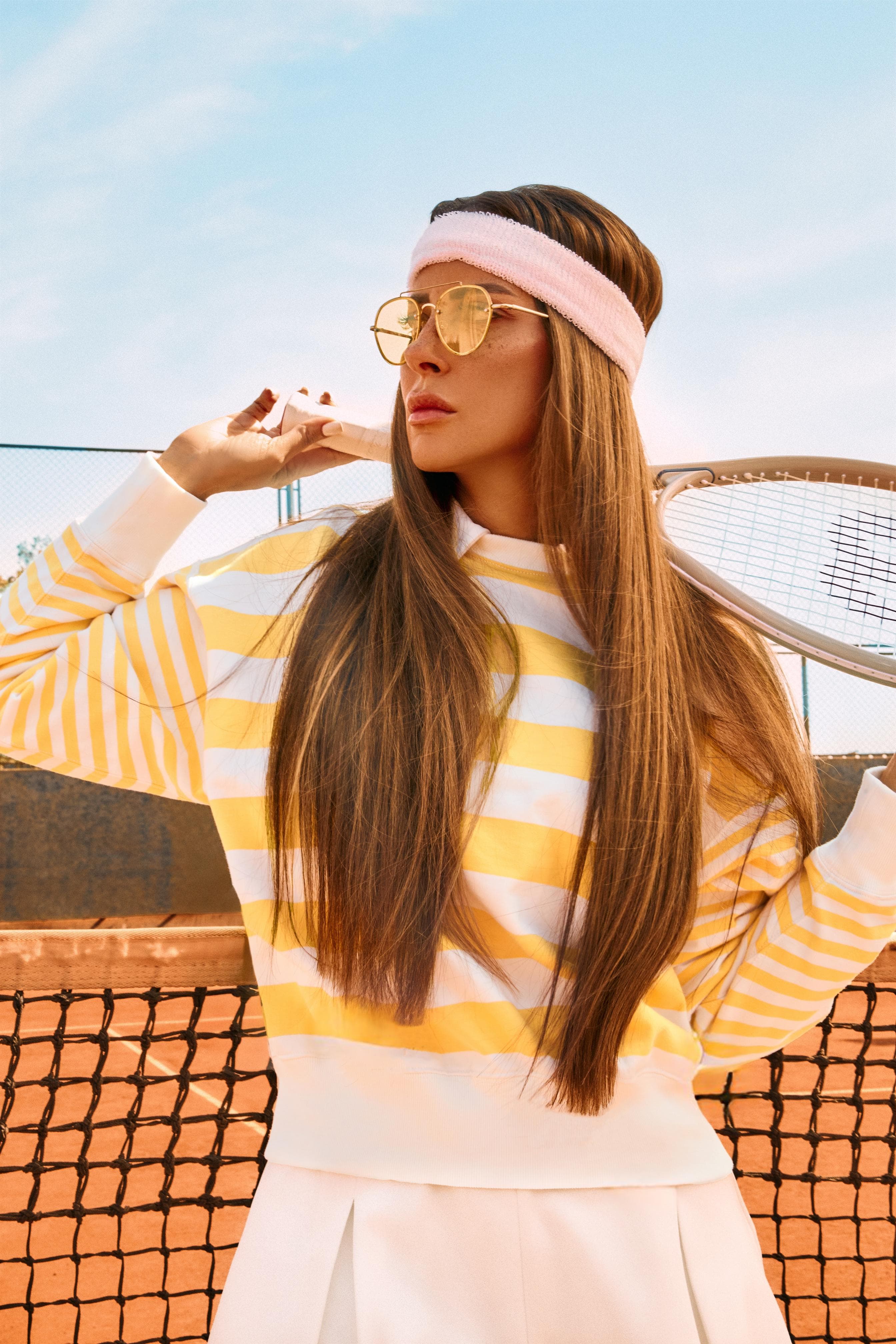وظهرت ريم مصطفى خلال جلسة التصوير داخل أحد ملاعب التنس، مرتدية أزياء رياضية عصرية جمعت بين العملية والأناقة؛ إذ تنوعت إطلالاتها بين فستان تنس قصير باللونين الأسود والأبيض، مع حذاء رياضي وجوارب طويلة، إلى جانب إطلالة أخرى بكنزة رياضية قصيرة باللون الأخضر الفاتح مع تنورة بيضاء، كما اعتمدت إكسسوارات بسيطة ونظارة شمسية عصرية.
