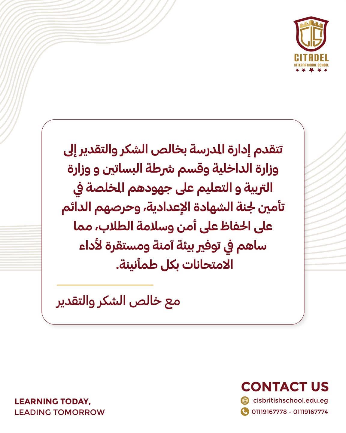 استجابة وشكر.. مدرسة ”سيتادل الدولية” تشيد بجهود وزارة الداخلية والتعليم في تأمين امتحانات الشهادة الإعدادية