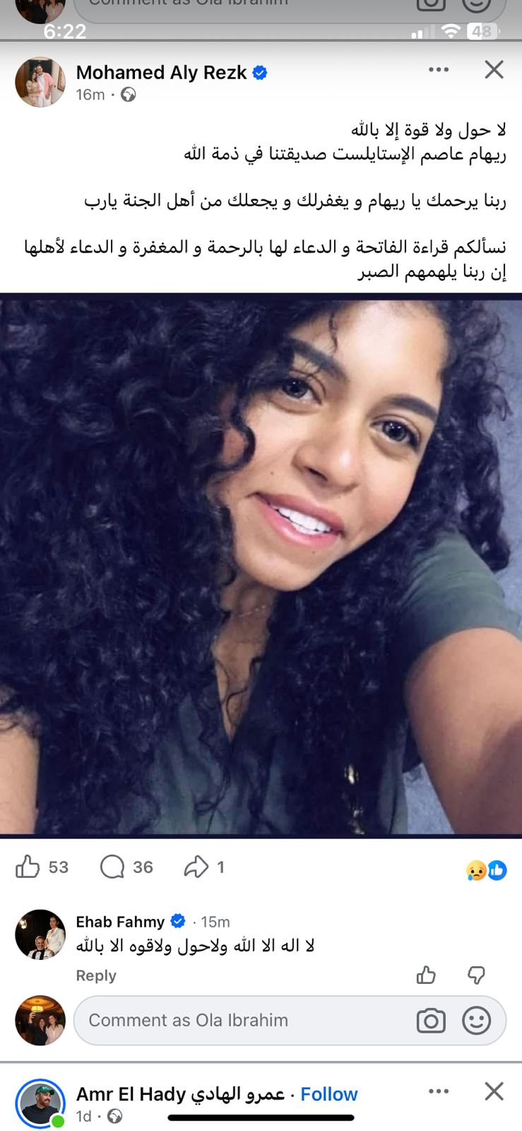 وكتب الفنان عبر صفحته الشخصية على موقع التواصل الإجتماعي فيسبوك: لا حول ولا قوة إلا بالله ريهام عاصم الإستايلست صديقتنا في ذمة الله، ربنا يرحمك يا ريهام و يغفرلك و يجعلك من أهل الجنة يارب، نسألكم قراءة الفاتحة و الدعاء لها بالرحمة و المغفرة و الدعاء لأهلها إن ربنا يلهمهم الصبر.