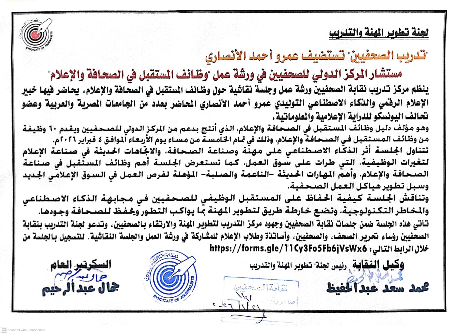 تأتي هذه الجلسة ضمن جلسات نقابة الصحفيين وجهود مركز التدريب لتطوير المهنة والارتقاء بالصحفيين، وتدعو لجنة التدريب بنقابة الصحفيين رؤساء تحرير الصحف، والصحفيين، وأساتذة وطلاب الإعلام للمشاركة في ورشة العمل والجلسة النقاشية. للتسجيل بالجلسة من خلال الرابط التالي: https://forms.gle/11Cy3Fo5Fb6jVsWx6