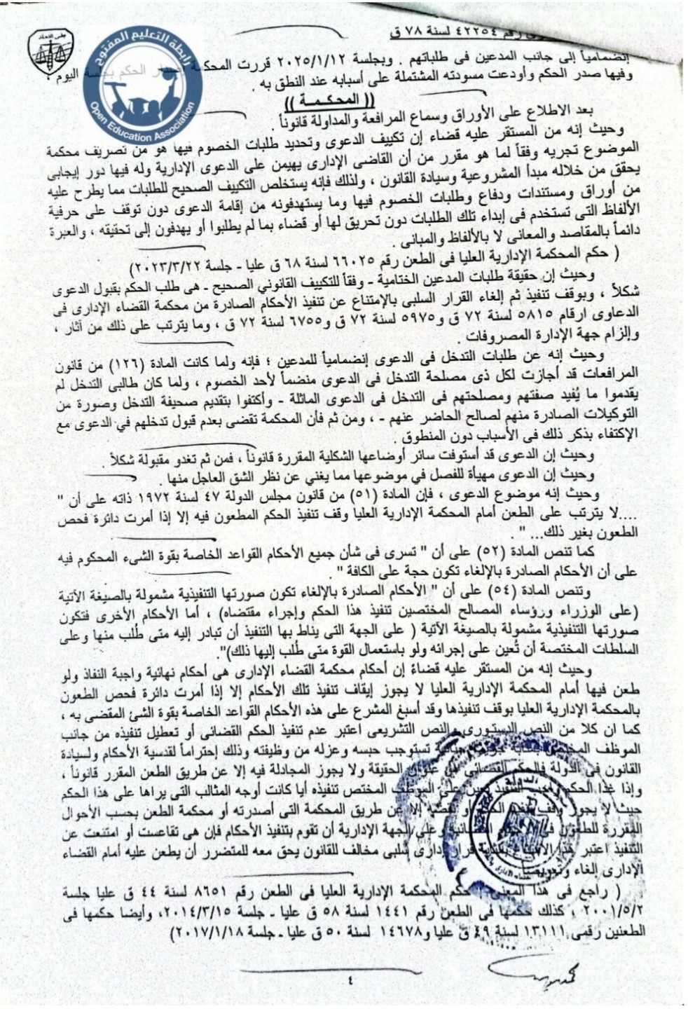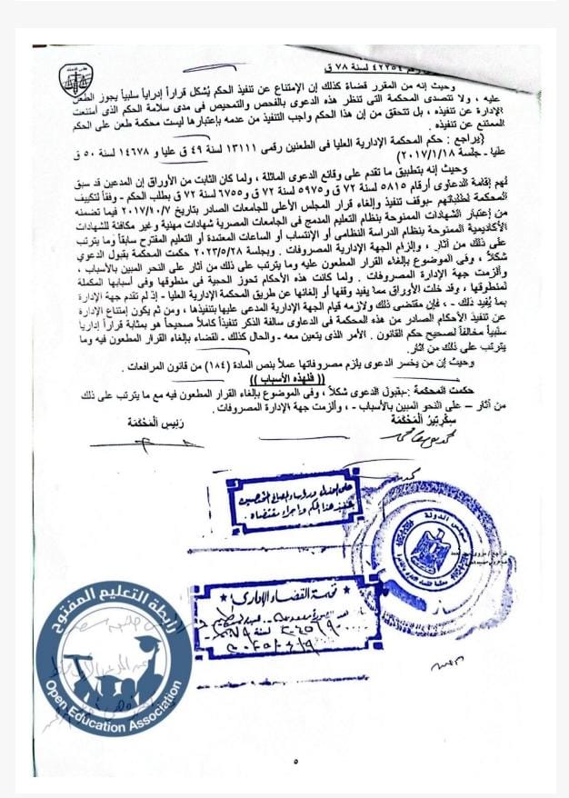 5 أحكام قضائية بعد 8 سنوات أمام القضاء الإداري تؤيد عودة التعليم المفتوح بشهادته الأكاديمية
