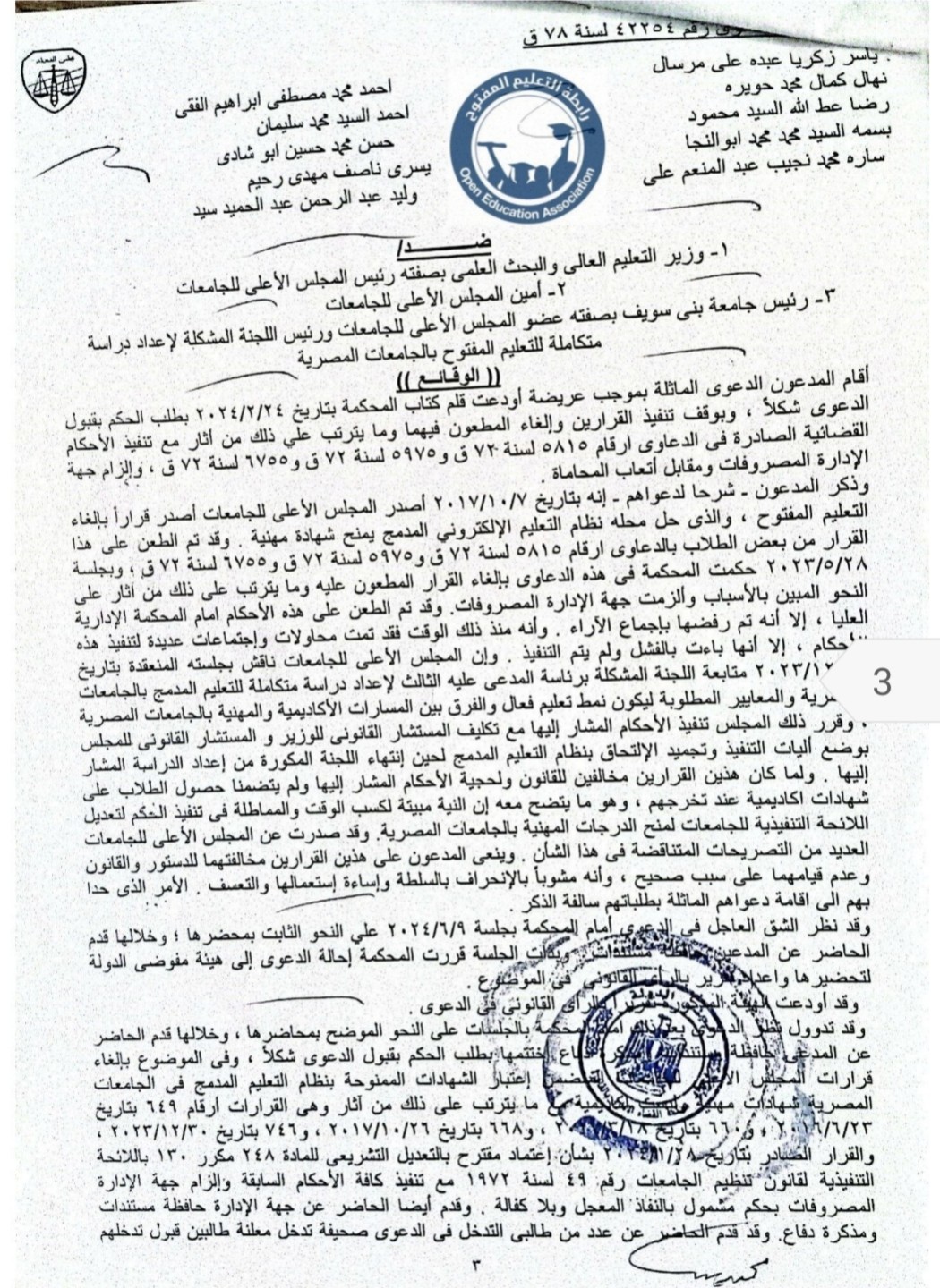 وأكد أنه خلال تلك الفترة توجه أعضاء رابطة التعليم المفتوح مرارًا وتكرارًا إلى وزارة التعليم العالي بالعاصمة الإدارية والمجلس الأعلى للجامعات، وتقدموا بعدة شكاوى إلى مجلس الوزراء فى ٧١ سبتمبر ٣٢٠٢، طالبوا فيها بسرعة تنفيذ الحكم، ومشيرًا إلى أن المجلس الأعلى للجامعات، رد عليهم في ٨ يناير ٤٢٠٢: «في إطار احترام الأحكام القضائية الحائزة لحجية الأمر المقتضى وإعلاء لكلمة الأحكام النهائية فيما قضت به وفصلت فيه، فالمجلس الأعلى للجامعات بصدد اتخاذ الإجراءات التنفيذية الضرورية لوضع الأحكام القضائية موضوع التنفيذ وبمراعاة مصلحة الطاعنين وتحقيق هذا النظام الفائدة التعليمية».
