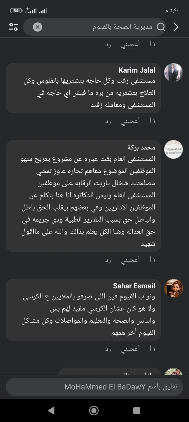 من جانبه، يذهب محمد بركة إلى أبعد من ذلك، معتبرًا أن المستشفى لم تعد تقدم خدمة عامة، بل أصبحت – على حد قوله – مشروعًا يتربح منه بعض العاملين، موضحًا: «المستشفى العام بقت عبارة عن مشروع، الموضوع تجارة، لو عاوز تمشي مصلحتك لازم تدفع الرقابة لازم تكون على الموظفين الإداريين مش الدكاترة، لأن في تقارير طبية بتقلب الحق باطل والباطل حق، ودي جريمة في حق العدالة، والكل عارف كده».