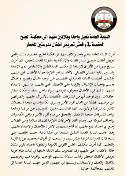 النيابة العامة تحيل 31 متهمًا إلى محكمة الجنح في واقعتَي تعريض أطفال مدرستين للخطر