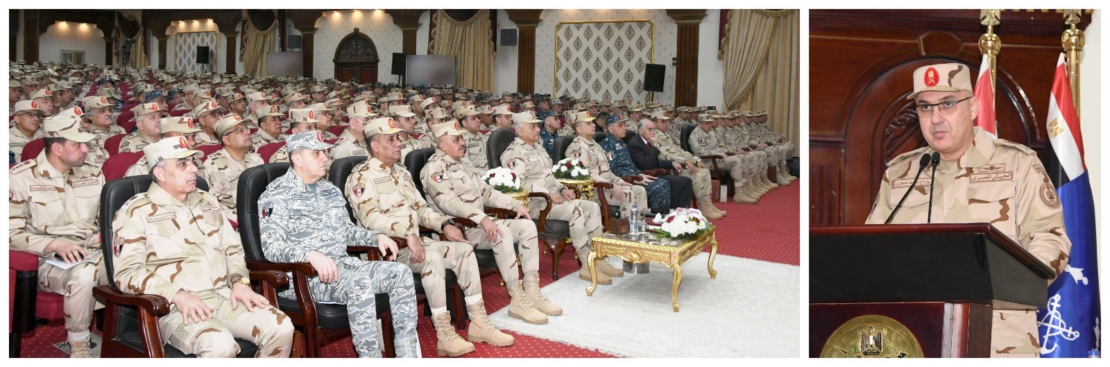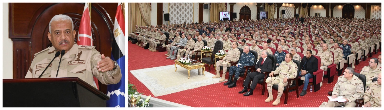 وألقى الفريق أول عبد المجيد صقر القائد العام للقوات المسلحة وزير الدفاع والإنتاج الحربى كلمة نقل خلالها تحيات وتقدير الرئيس عبد الفتاح السيسي رئيس الجمهورية القائد الأعلى للقوات المسلحة وإعتزازه بالجهد الذى يبذله رجال القوات المسلحة فى صون مقدرات الوطن ، مؤكداً على ضرورة قيام القادة والضباط على كافة المستويات بالمحافظة على مستوى الإستعداد القتالى لوحداتهم والإهتمام بالمقاتلين بإعتبارهم الركيزة الأساسية لقواتنا المسلحة ليكونوا قادرين على تنفيذ مختلف المهام الموكلة إليهم بكفاءة وإتقان وروح معنوية عالية , وكذلك أهمية التسلح بالوعى المستنير لما تشهده المرحلة الحالية من تحديات للحفاظ على أمن الوطن وسلامة أراضيه .