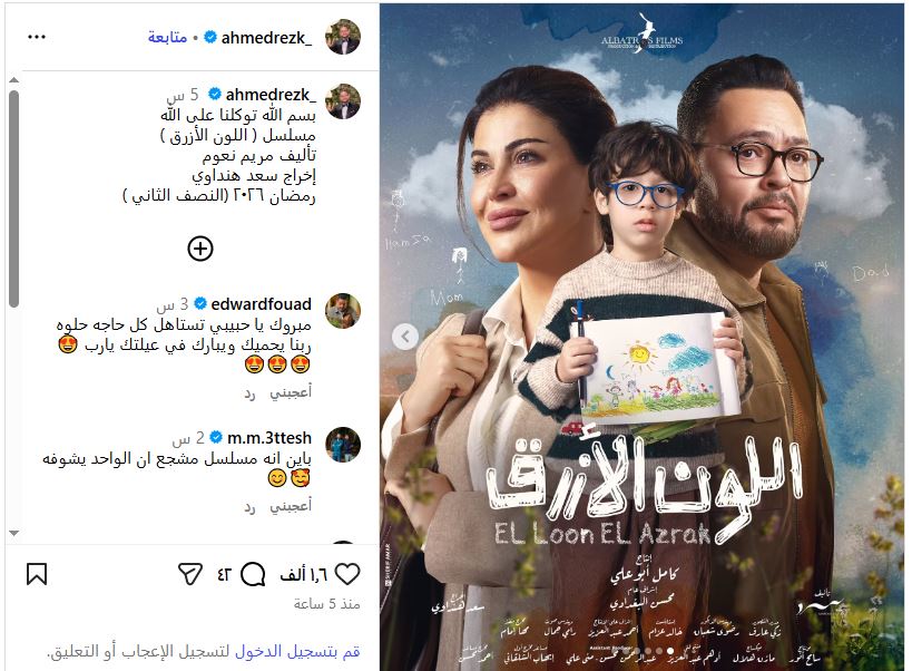ونشر رزق عبر حسابه الرسمى على إنستجرام البوسترات الترويجية للمسلسل، وكتب: بسم الله توكلنا على الله مسلسل اللون الأزرق، تأليف مريم نعوم وإخراج سعد هنداوى، رمضان 2026 النصف الثاني.