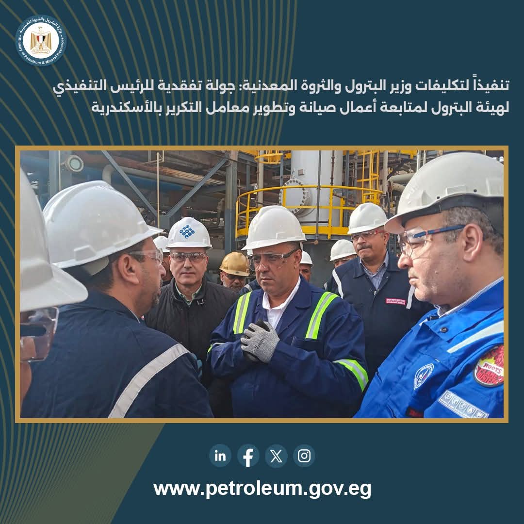 جولة تفقدية للرئيس التنفيذي لهيئة البترول لمتابعة أعمال صيانة وتطوير معامل التكرير بالأسكندرية