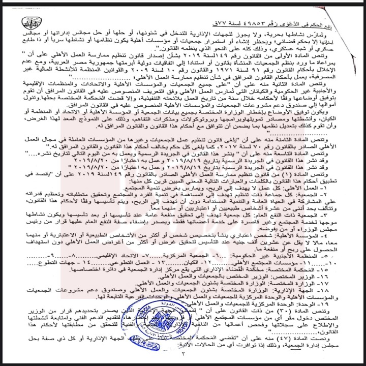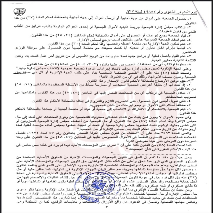 وأكدت المحكمة، في حيثيات حكمها، أن وجدانها قد اطمأن وثبت لديها بشكل قاطع صحة الوقائع والمخالفات محل الدعوى، مشيرة إلى أن مجلس إدارة المؤسسة تقاعس عن تصويب الأوضاع القانونية، واستمر في ارتكاب المخالفات رغم منحه الفرصة الكاملة لتداركها، في مخالفة صريحة لأحكام المادة (48) من قانون تنظيم ممارسة العمل الأهلي.