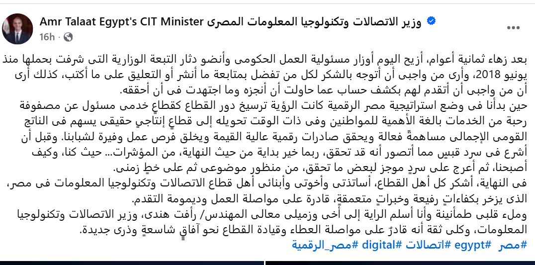 بعد زهاء ثمانية أعوام من توليه المسؤولية، قال الدكتور عمرو طلعت، وزير الاتصالات وتكنولوجيا المعلومات السابق، إنه يطوي اليوم صفحة العمل الحكومي، مؤكدًا أن تلك الفترة كانت محل شرف ومسؤولية حملها منذ يونيو 2018.