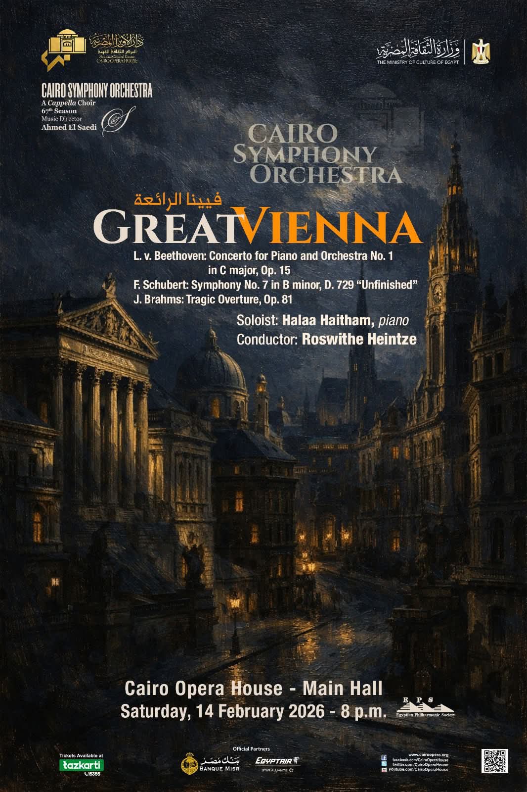 تحت عنوان فيينا الرائعة تقيم دار الأوبرا المصرية برئاسة الدكتور علاء عبد السلام حفلا لأوركسترا القاهرة السيمفونى تحت إشراف مديره الفنى والقائد الأساسى المايسترو أحمد الصعيدى وتقوده المايسترو الألمانية روزويتا هاينتزه وتشارك خلاله عازفة البيانو حلا هيثم وذلك فى الثامنة مساء السبت ١٤ فبراير على المسرح الكبير .