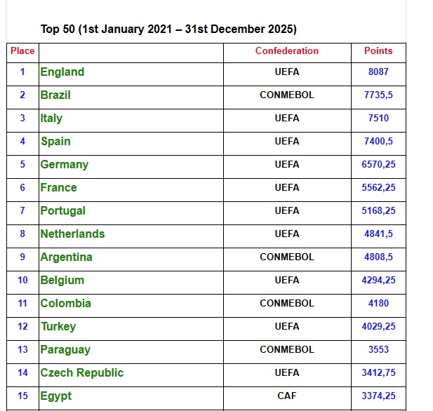 وعلى الصعيد العربي والإفريقي، حقق الدوري المصري الممتاز إنجازًا لافتًا بحلوله في المركز 15 عالميًا برصيد 3374.25 نقطة، ليصبح الأعلى تصنيفًا بين جميع الدوريات العربية والإفريقية في القائمة.