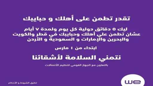 وبحسب بيان الجهاز اليوم، تقرر منح كل مشترك خمس دقائق دولية مجانية تستخدم للاتصال بكلٍ من: السعودية، والإمارات، ودولة قطر، والبحرين، ودولة الكويت، والأردن.