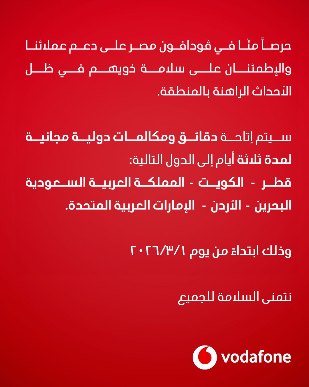 أعلنت شركة فودافون مصر منح عملائها دقايق مجانية للاطمئنان علي ذويهم في 6 دول عربية . وأكدت الشركة أنه سيتم إتاحة دقائق ومكالمات دولية مجانية لمدة ثلاثة أيام بكل من قطر - الكويت - المملكة العربية السعودية -البحرين - الأردن - الإمارات العربية المتحدة.