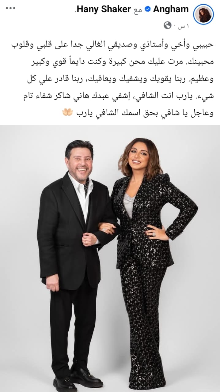 وأكملت أنغام: " ربنا يقويك ويشفيك ويعافيك، ربنا قادر على كل شيء.. يارب أنت الشافي اشفي عبدك هاني شاكر شفاء تام وعاجل يا شافي بحق اسمك الشافي يارب".