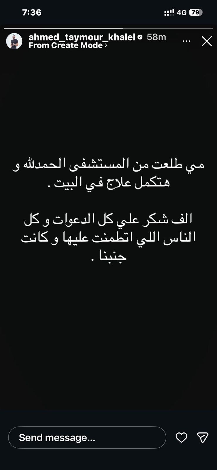 فكتب أحمد تيمور عبر حسابه الشخصي بموقع الصور والفيديوهات الأشهر “إنستجرام”، وقال " مي طلعت من المستشفى الحمد لله، وهتكمل علاج في البيت، ألف شكر على كل الدعوات، وكل الناس اللي اتطمنت عليها وكانت جنبنا".