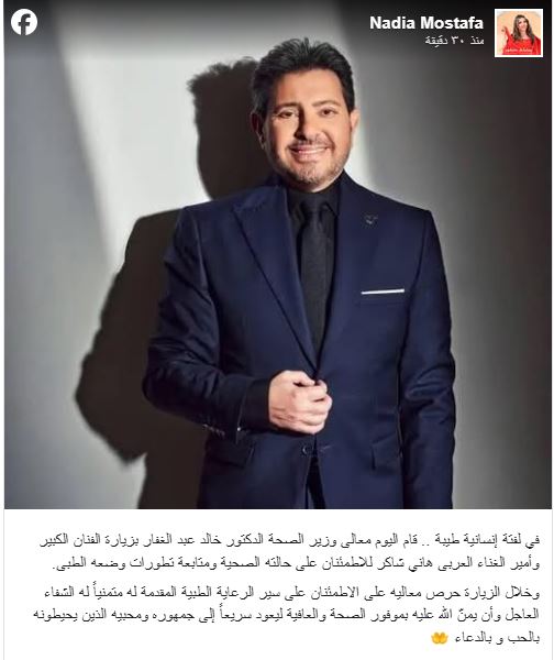 وكتبت نادية مصطفى عبر حسابها بـ فيس بوك: في لفتة إنسانية طيبة، زار وزير الصحة الدكتور خالد عبد الغفار الفنان الكبير وأمير الغناء العربي هاني شاكر للاطمئنان على حالته الصحية ومتابعة تطورات وضعه الطبي.