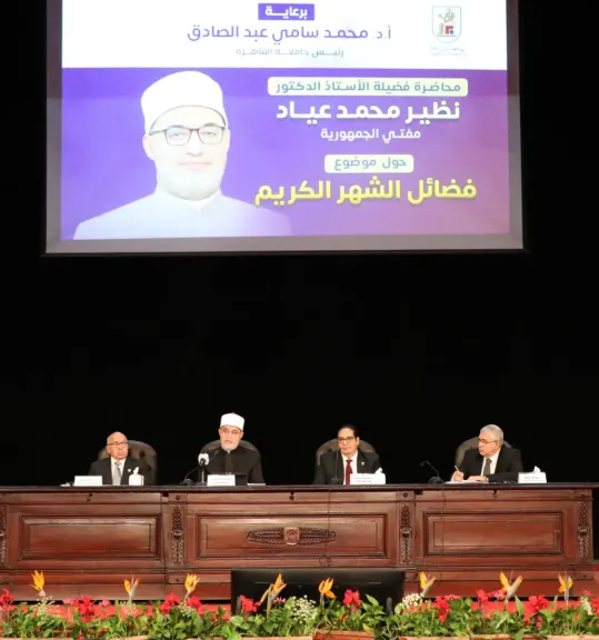 ألقى فضيلة أ.د. نظير محمد عياد، مفتي الجمهورية رئيس الأمانة العامة لدُور وهيئات الإفتاء في العالم، اليوم الثلاثاء محاضرة بجامعة القاهرة، بعنوان "فضائل الشهر الكريم" ، وذلك ضمن فعاليات الموسم الثقافي للجامعة، بحضور الأستاذ الدكتور محمد سامي عبد الصادق رئيس جامعة القاهرة، ونوَّاب رئيس الجامعة، وعدد من قيادات الجامعة وأساتذتها، وحشد كبير من طلبة جامعة القاهرة من مختلف الكليات.