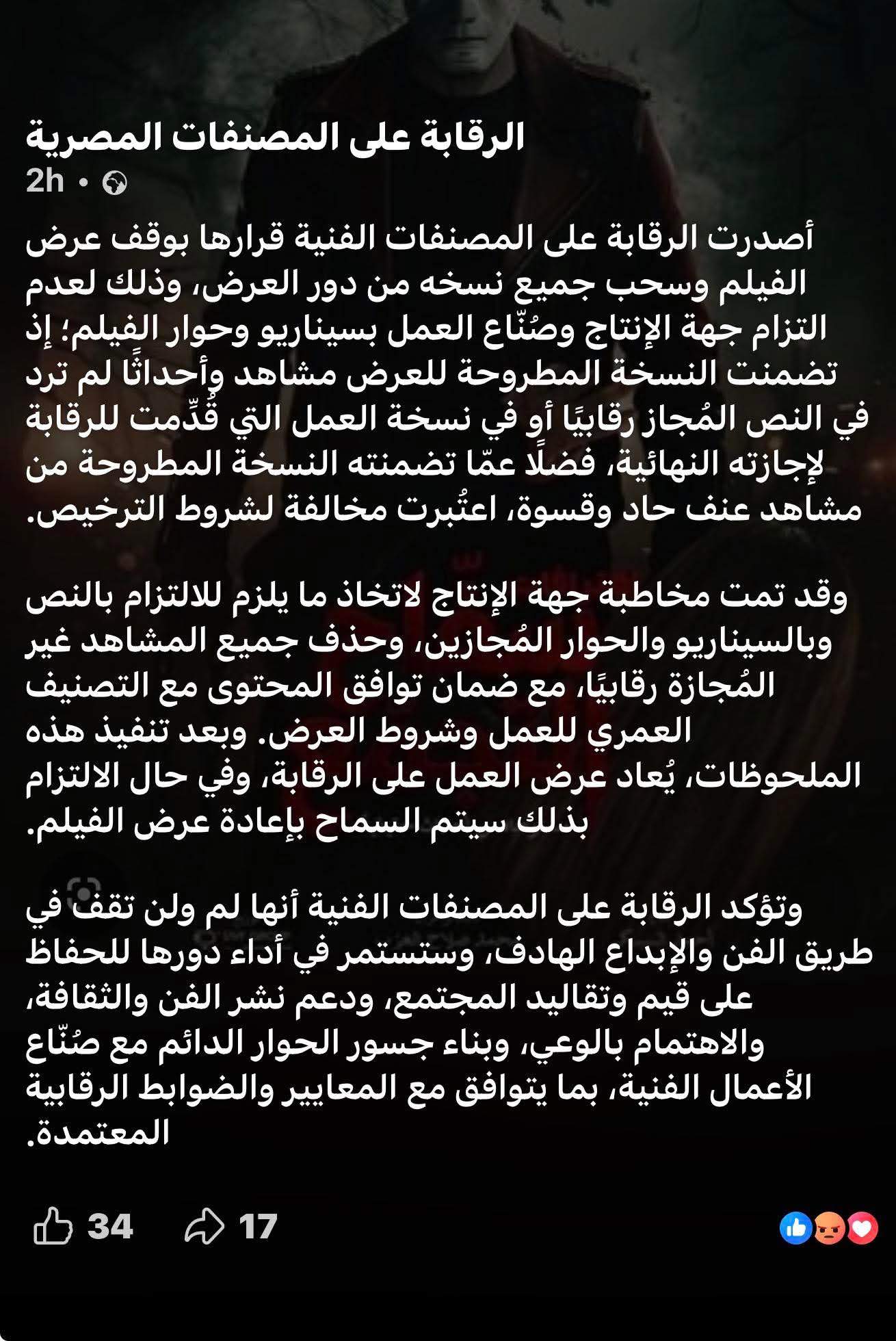وجاء قرار الرقابة على المصنفات الفنية بسبب عدم تطابق النص المصور مع النص المجاز رقابياً، واحتواء الفيلم على مشاهد عنف اعتبرتها الجهات المختصة مخالفة لشروط الترخيص.