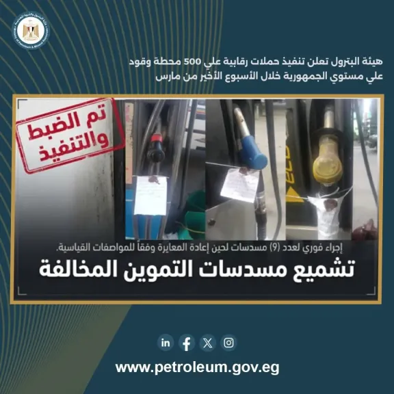 أعلنت الهيئة المصرية العامة للبترول تنفيذ حملات رقابية موسعة على أكثر من 500 محطة وقود على مستوى الجمهورية خلال الأسبوع الأخير من مارس، في إطار تشديد الرقابة على منظومة تداول المنتجات البترولية وضمان انتظام الإمدادات بالسوق المحلي.
