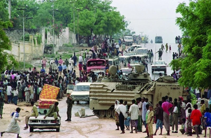 وفي الصومال، تجلت حدود القوة العسكرية بشكل أكثر حدة، عملية أممية إنسانية بقيادة الولايات المتحدة تحولت إلى اشتباك دموي في مقديشو عام 1993، حيث حاولت قوة دلتا الأمريكية القبض على قادة تابعين للزعيم الصومالي محمد فرح عيديد، مما أدى لاندلاع معركة عنيفة أسفرت عن سقوط مروحتي "بلاك هوك" ومقتل 18 جنديا أمريكيا، أدى إلى تدخل بري أمريكي محدود لانتشال القتلى الأمريكيين.